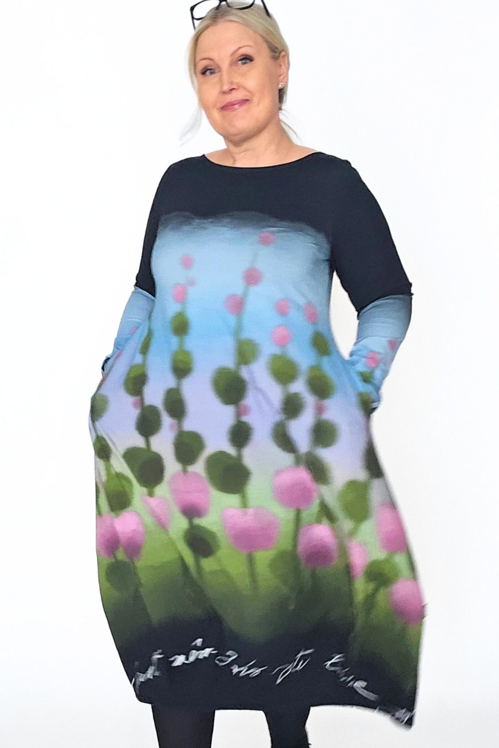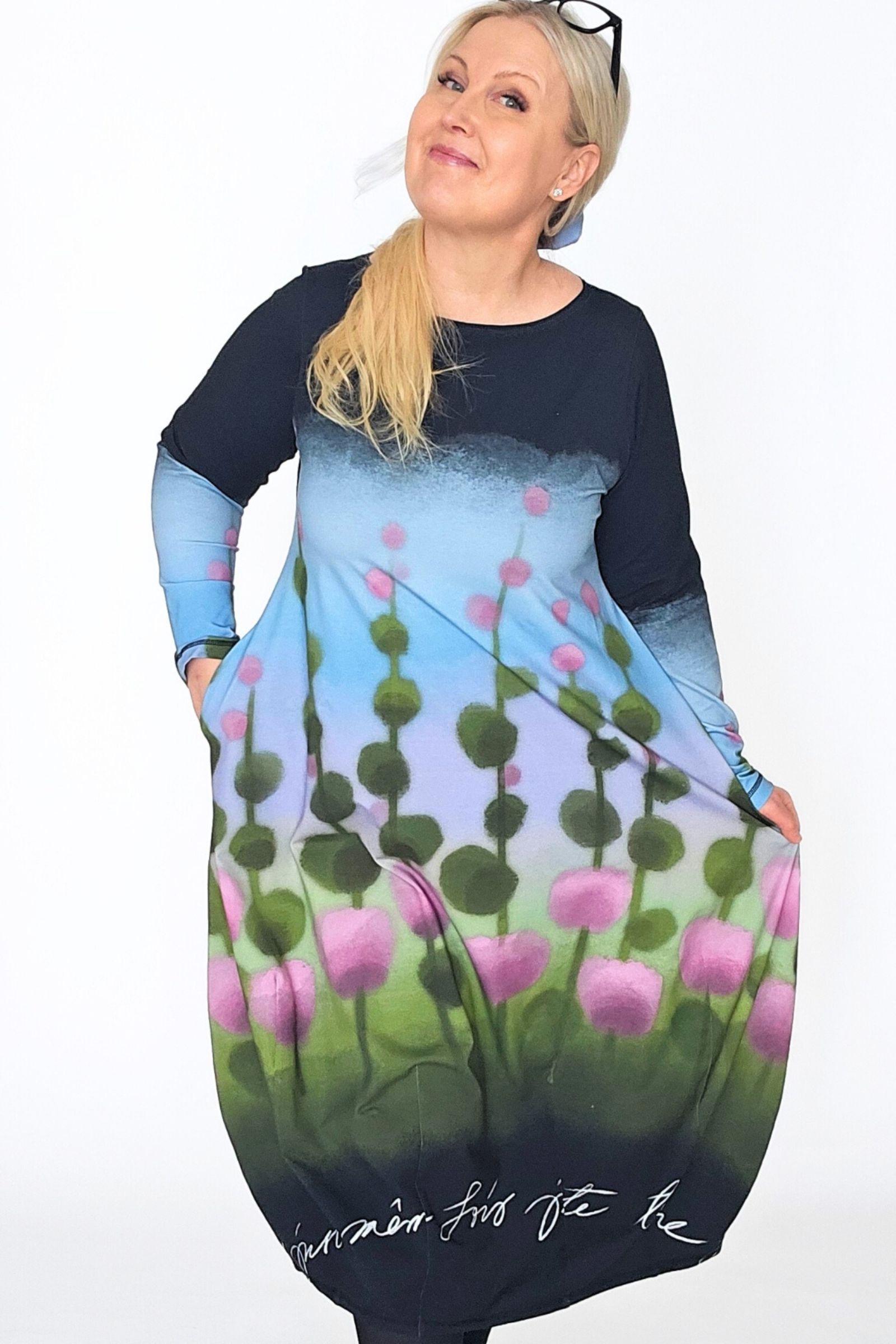 Tämä Balloon mekko on kokoa 44. Kaunis leveä pääntie, pitkät-hihat ja sivusaumoissa taskut. Siro yläosa ja upean runsas pallomainen helma.