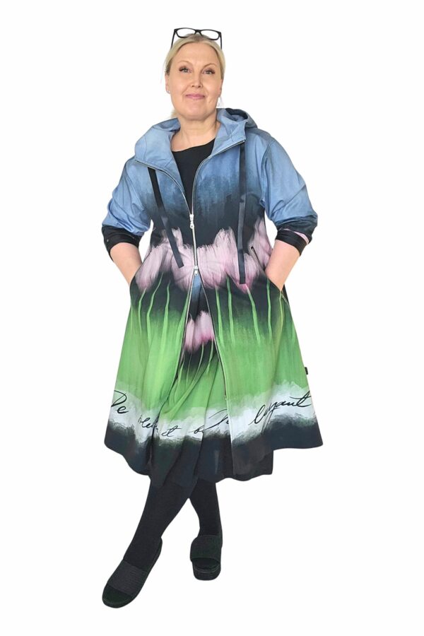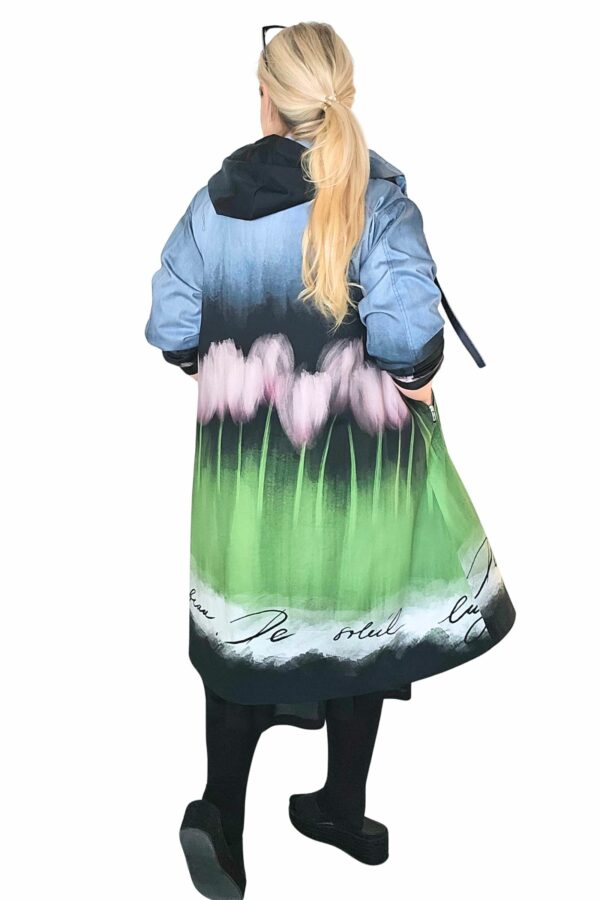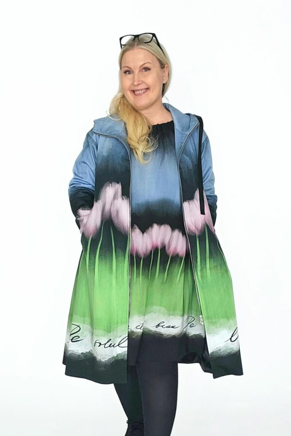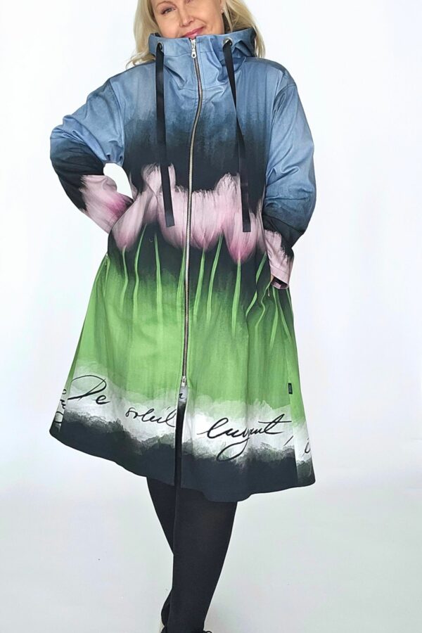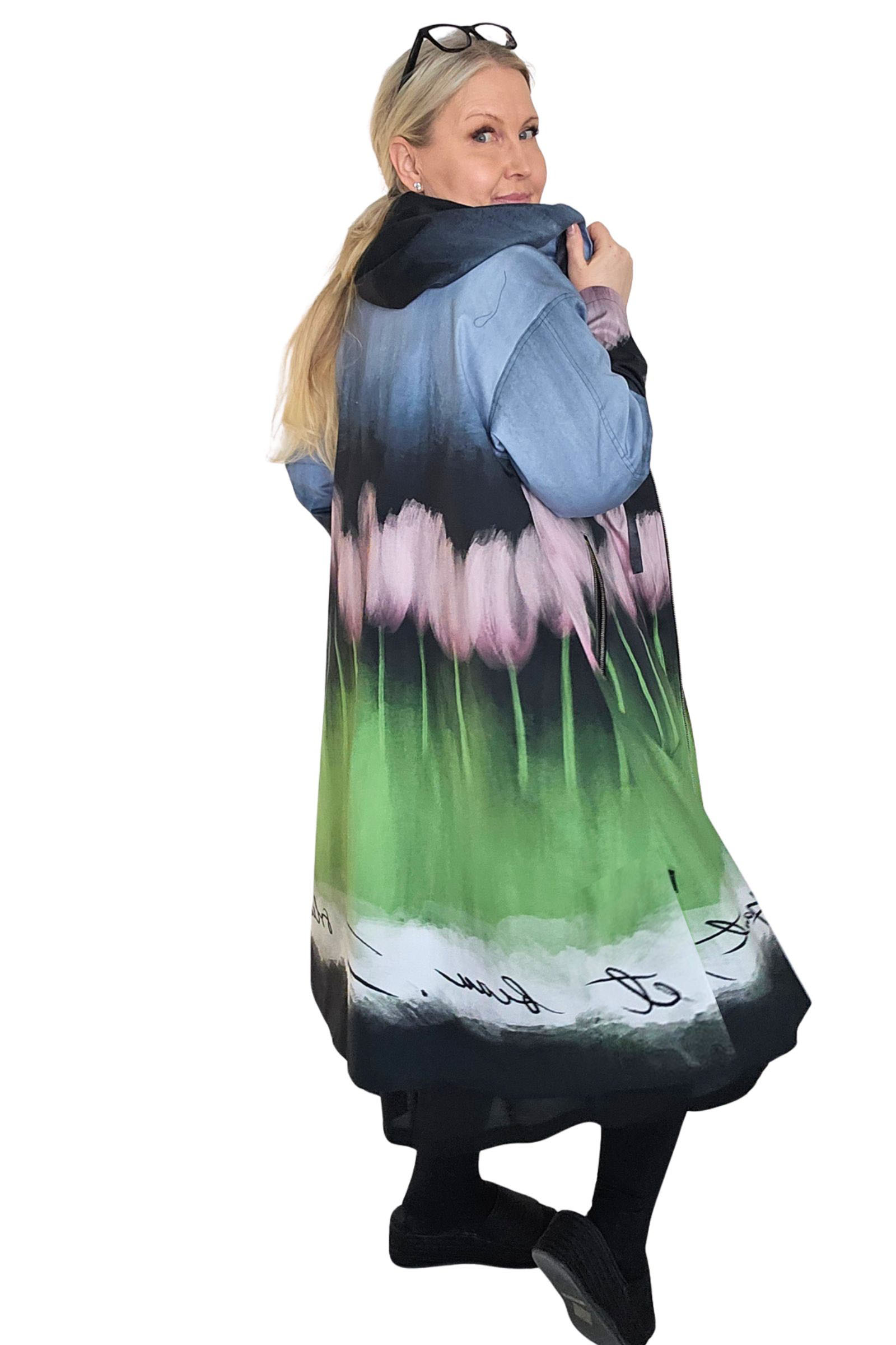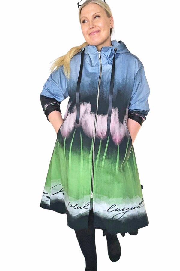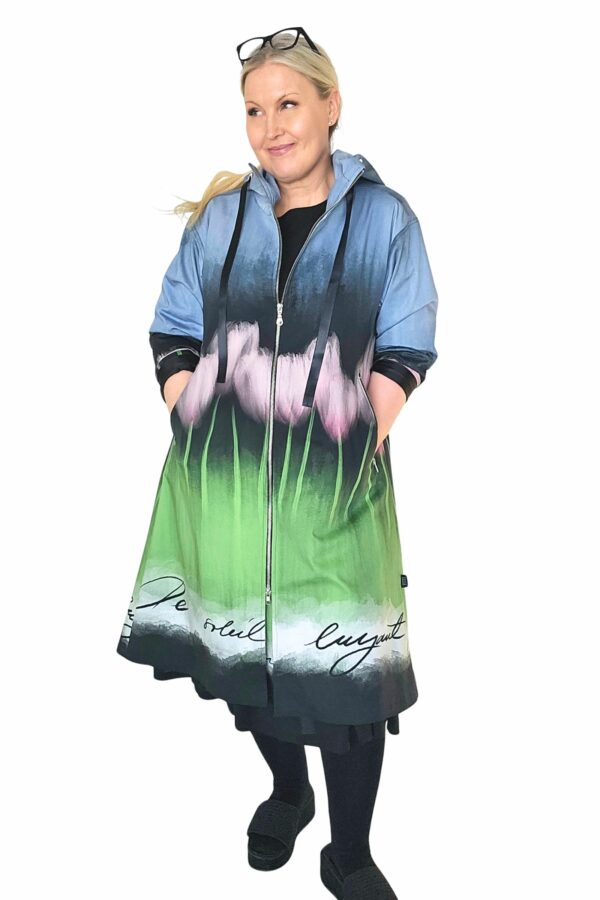 BestFriend-Tulppaanitakki on näyttävä ja ihanan mukava takki joka pitää sinut upeana keväästä syksyyn. Takki on A-linjainen ja istuvuudeltaan oversize. Se on midi-mittainen, eli hieman polven alle ulottuva. Takki on kokonaan vuoritettu ja siinä on laadukkaat yksityiskohdat: kaksisuuntainen pitkä vetoketju edessä, vinot vetoketjutaskut, ja reilu huppu jossa suuret purjerenkaat ja kujassa kaunis musta satiininauha.