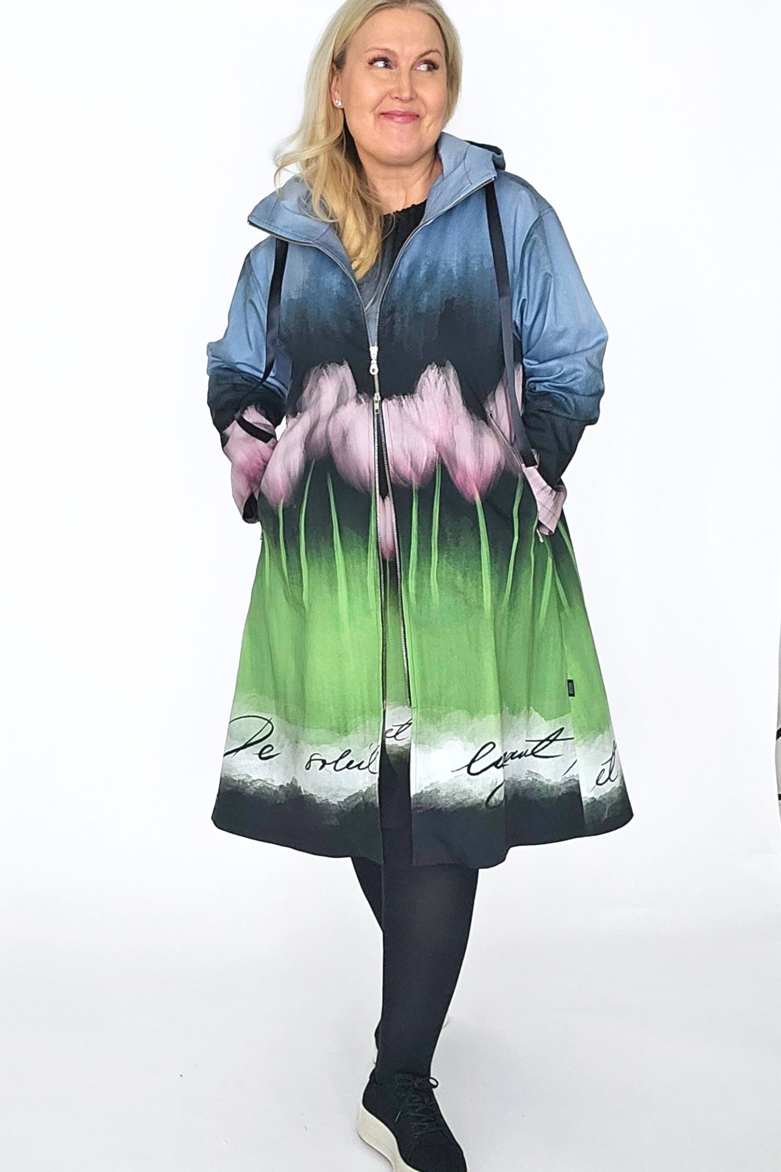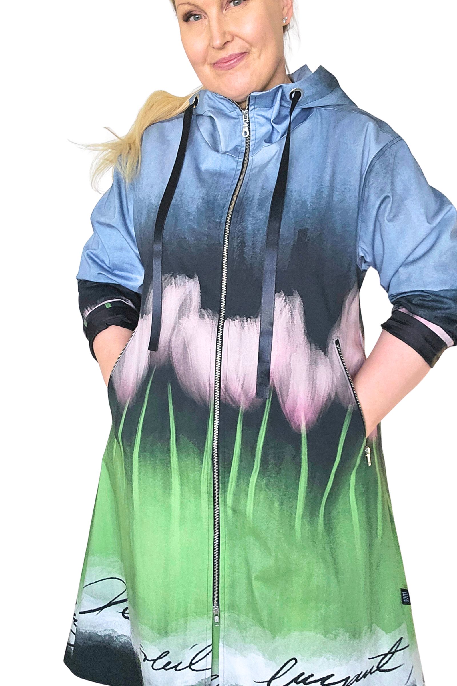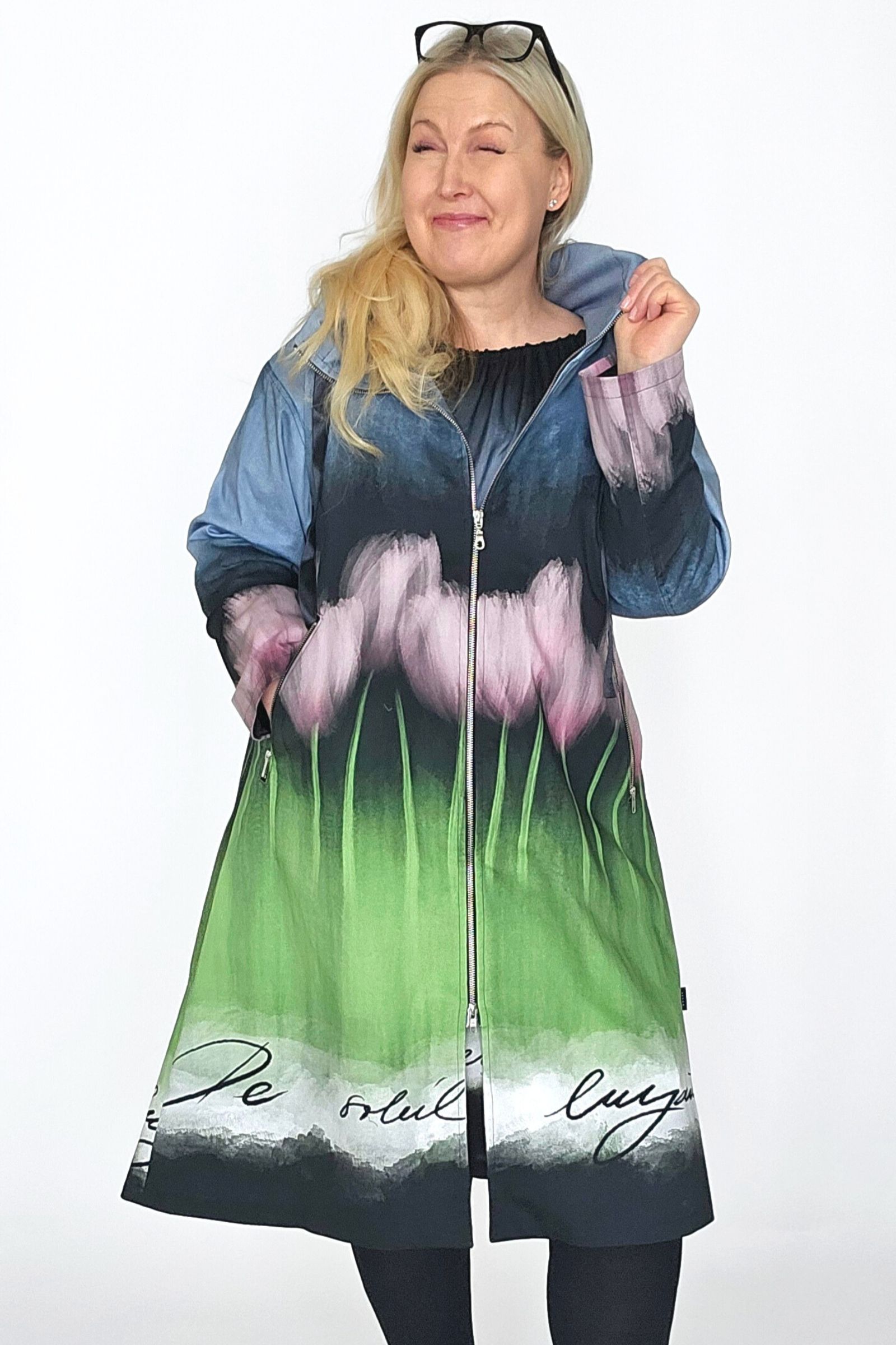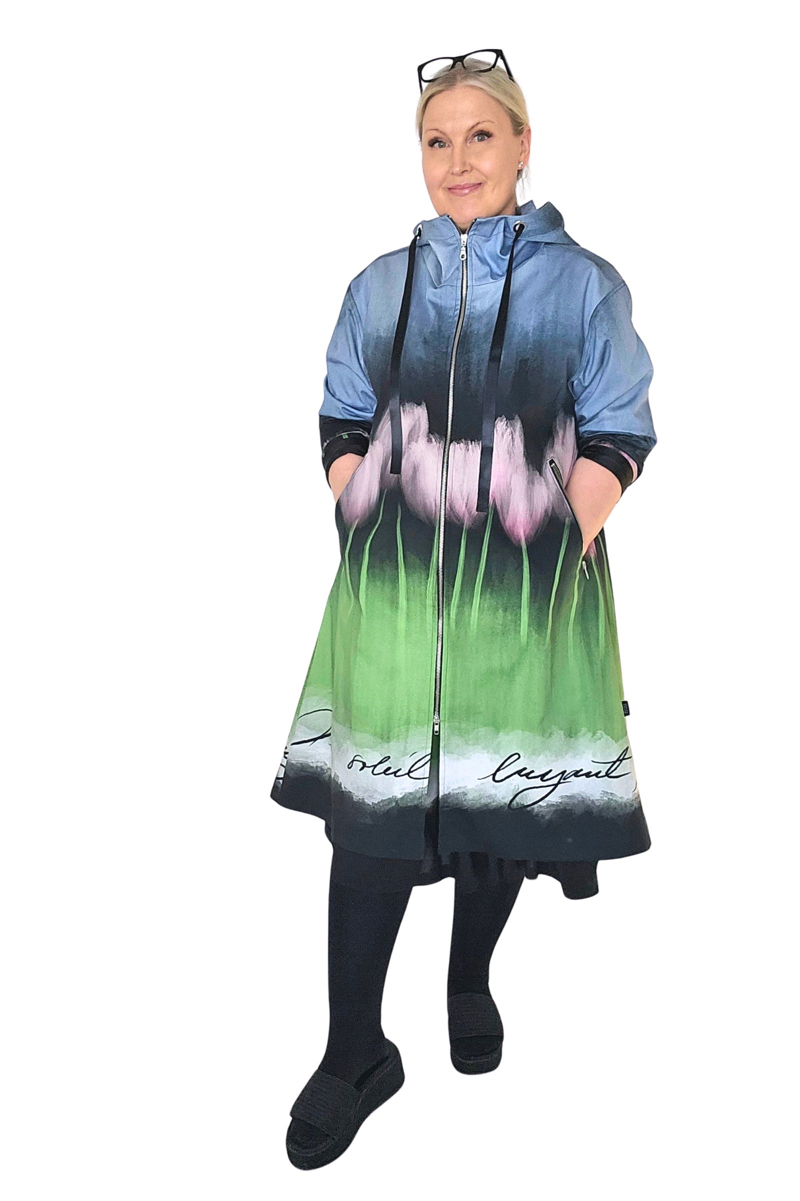 BestFriend-Tulppaanitakki on näyttävä ja ihanan mukava takki joka pitää sinut upeana keväästä syksyyn. Takki on A-linjainen ja istuvuudeltaan oversize. Se on midi-mittainen, eli hieman polven alle ulottuva. Takki on kokonaan vuoritettu ja siinä on laadukkaat yksityiskohdat: kaksisuuntainen pitkä vetoketju edessä, vinot vetoketjutaskut, ja reilu huppu jossa suuret purjerenkaat ja kujassa kaunis musta satiininauha.