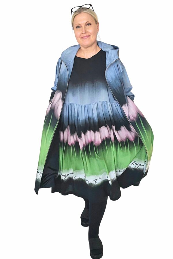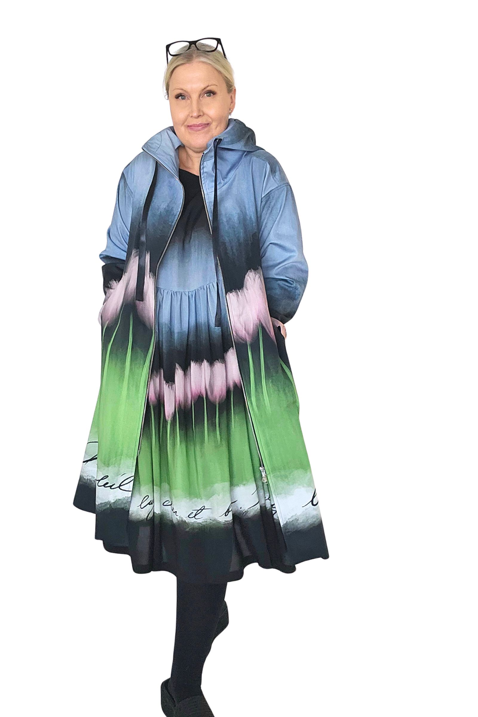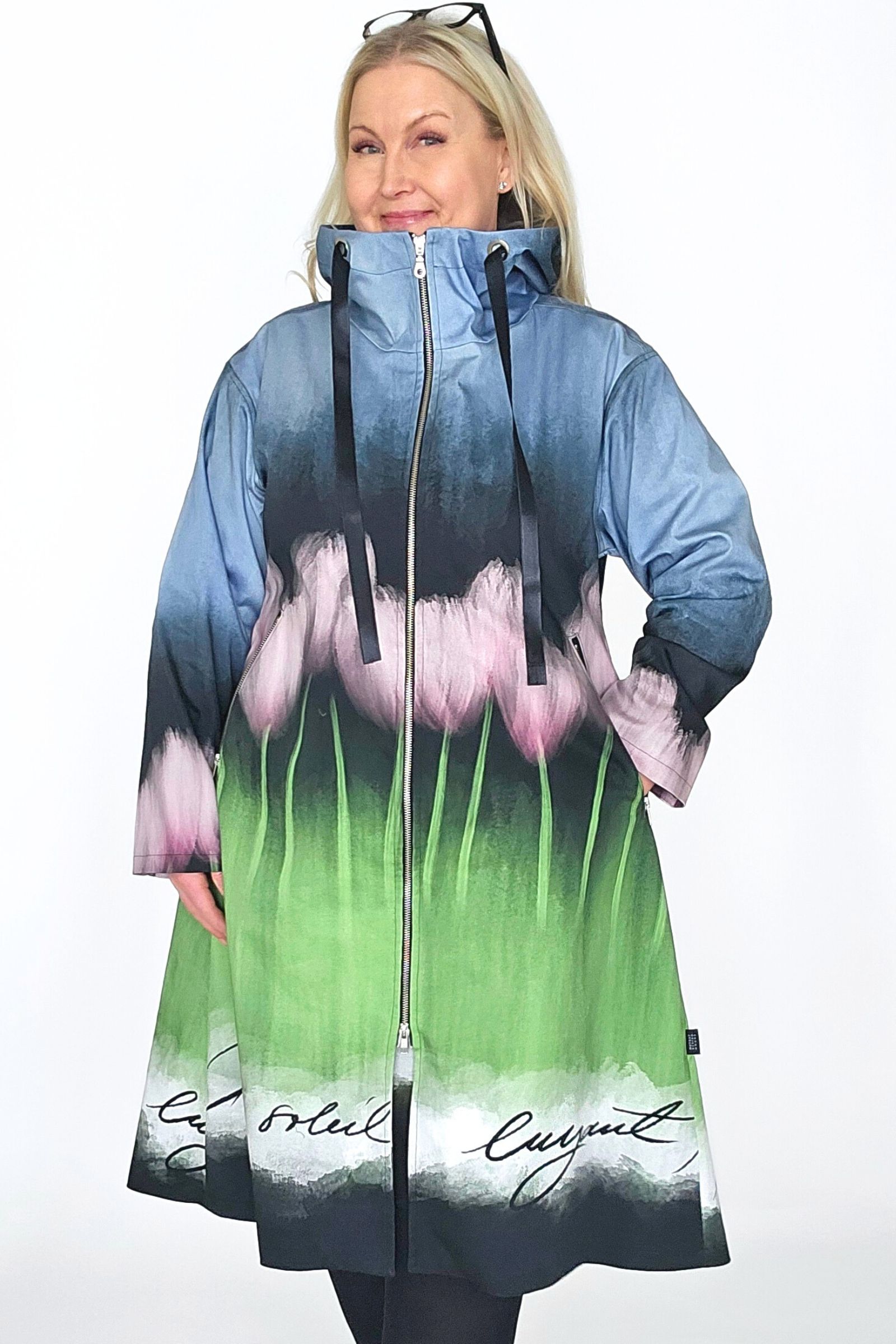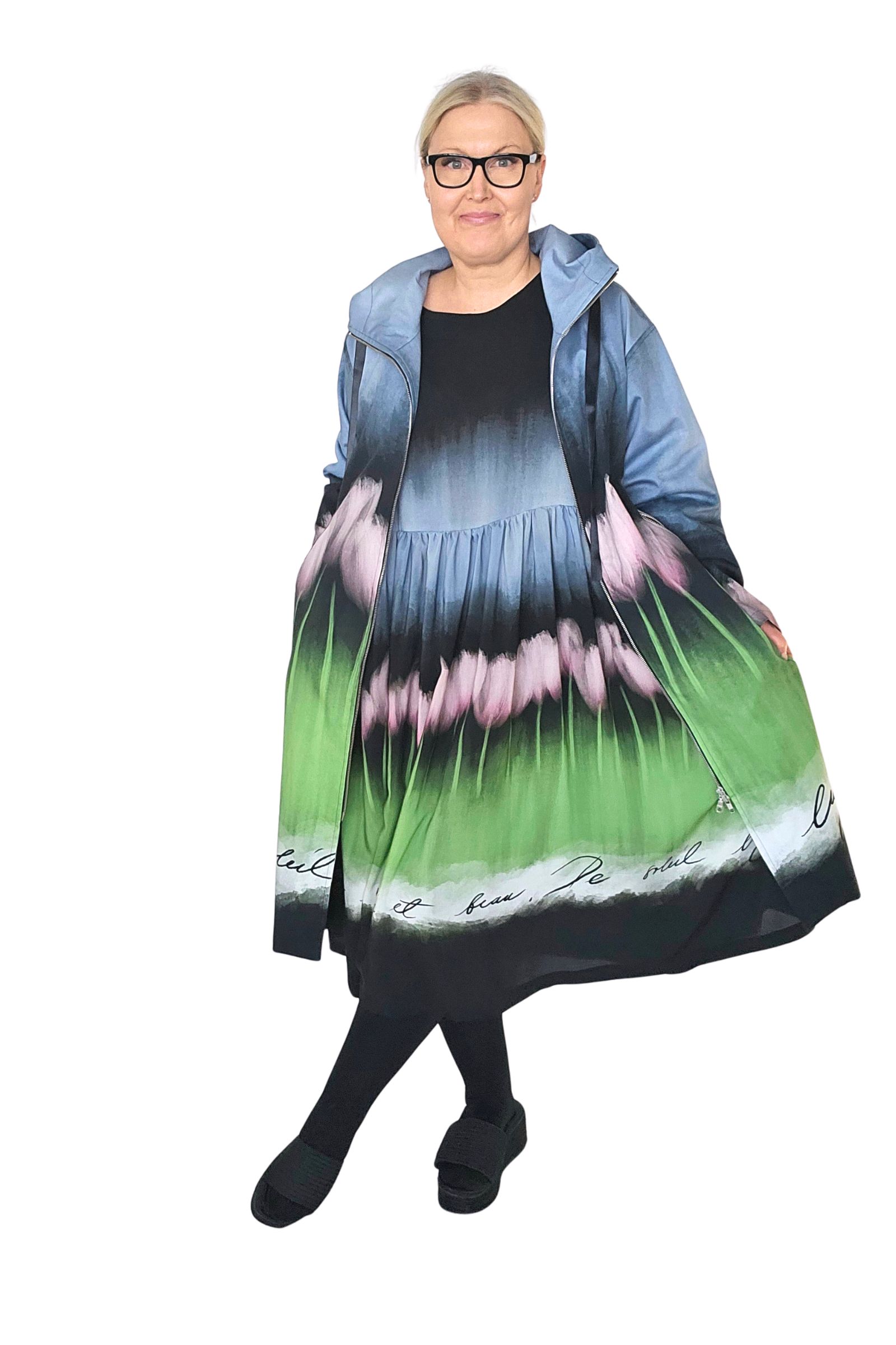 BestFriend-Tulppaanitakki on näyttävä ja ihanan mukava takki joka pitää sinut upeana keväästä syksyyn. Takki on A-linjainen ja istuvuudeltaan oversize. Se on midi-mittainen, eli hieman polven alle ulottuva. Takki on kokonaan vuoritettu ja siinä on laadukkaat yksityiskohdat: kaksisuuntainen pitkä vetoketju edessä, vinot vetoketjutaskut, ja reilu huppu jossa suuret purjerenkaat ja kujassa kaunis musta satiininauha.