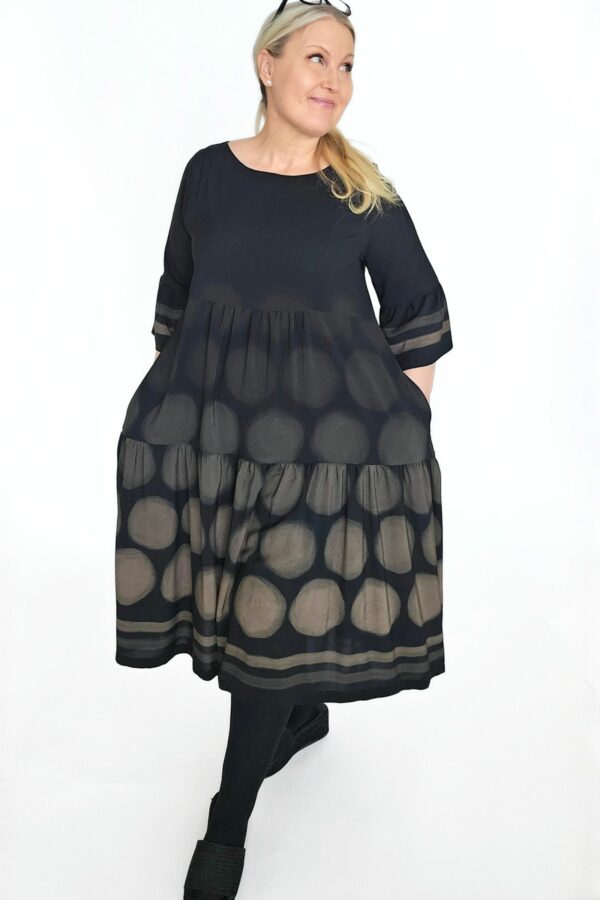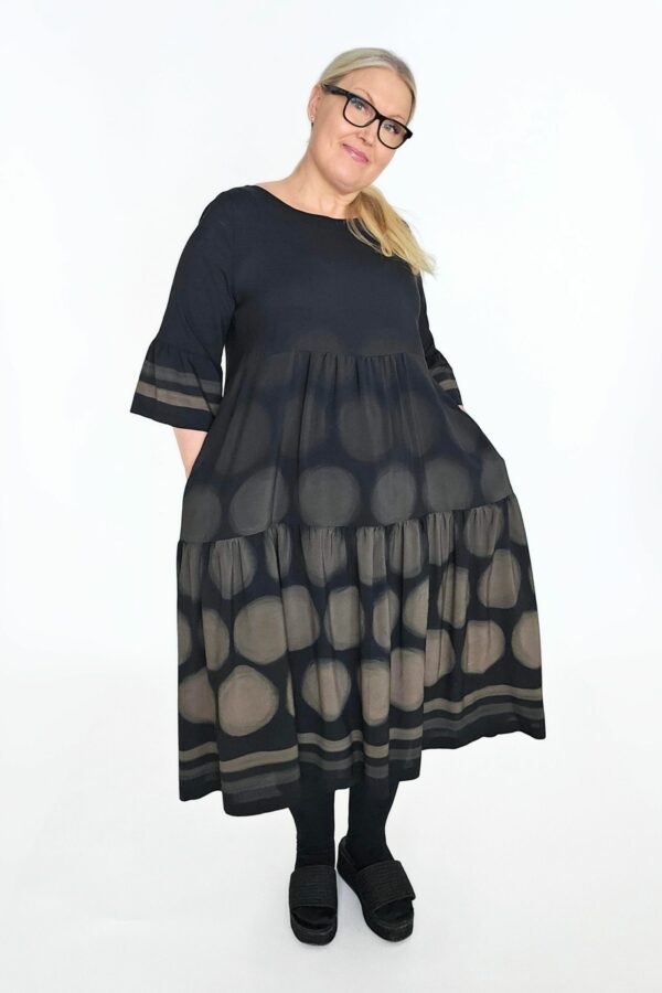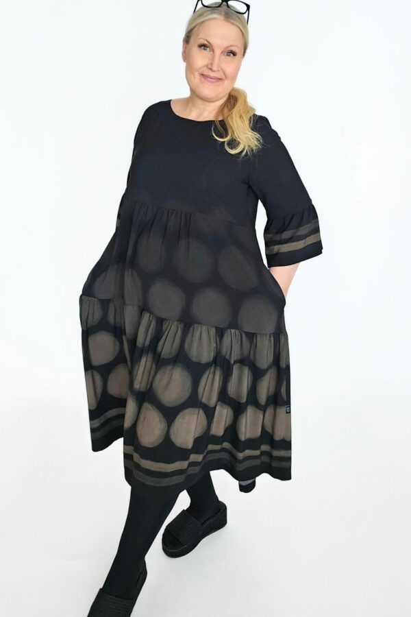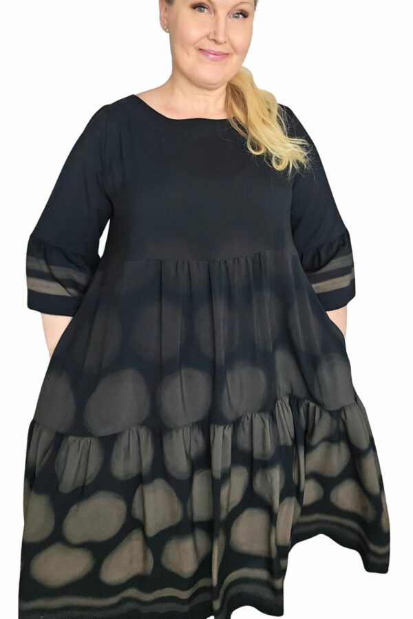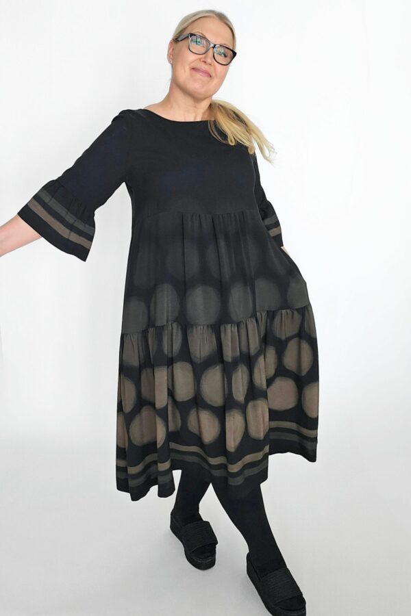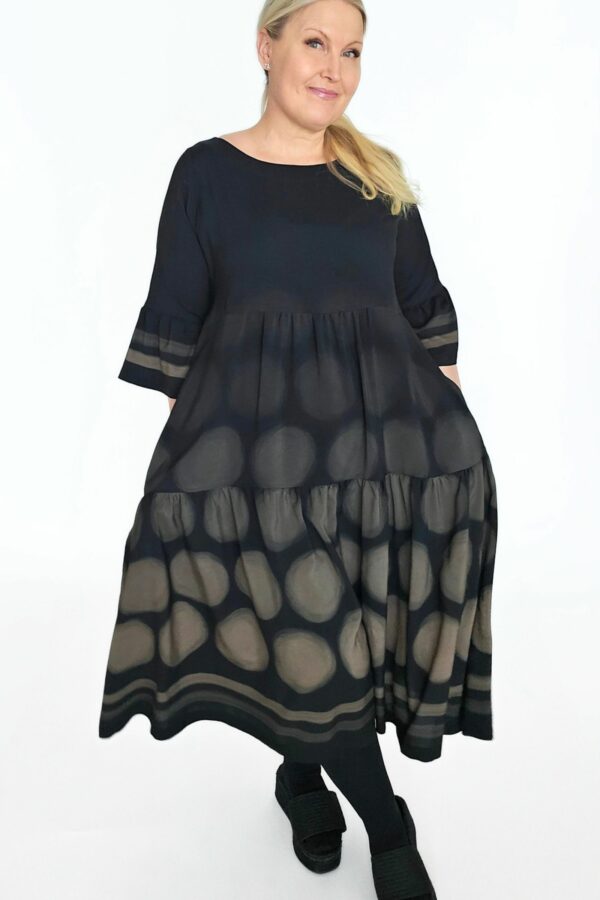 Poimuhelmainen ja -hihainen kerrosmekko utuisesta Kuunkajo-pallokuosista