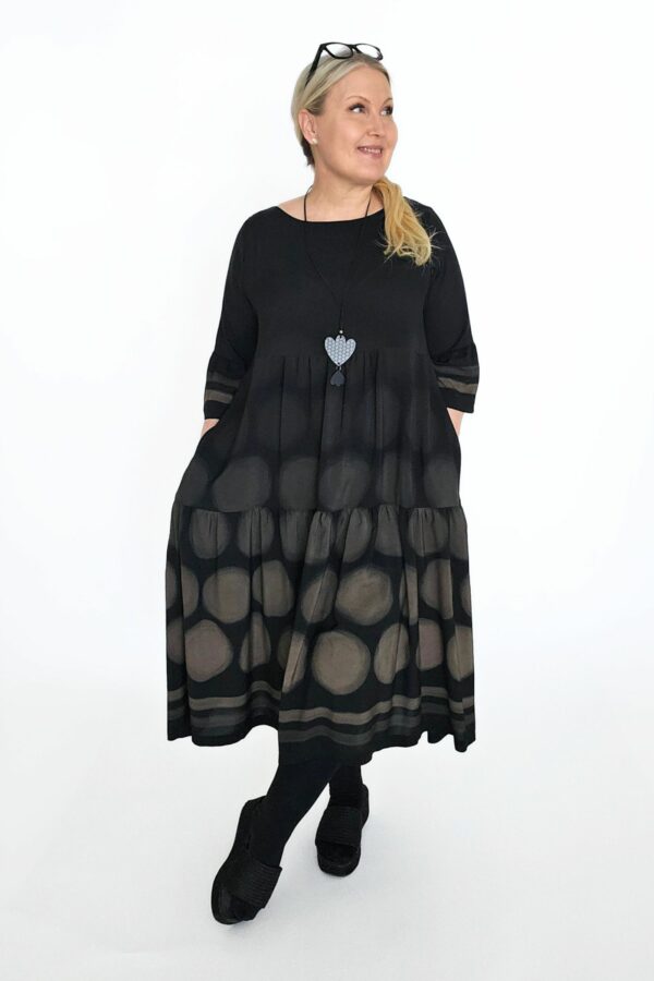 Kuunkajo on moderni vesiväritulkinta klassisesta pallokuosista. Sen suuret, utuiset pallot luovat kankaalle upean pystysuuntaisen jatkumon häipyen kerros kerrokselta näkymättömiin. Tuplaraidat helmassa ja hihansuissa tuovat ripauksen sporttisuutta tähän muuten niin seesteiseen kokonaisuuteen. Kuosin pohjaväri on syvän musta, ja kuvion väri on kaunis harmaanruskea, joka toistuu eri vahvuisena palloissa ja raidoissa.