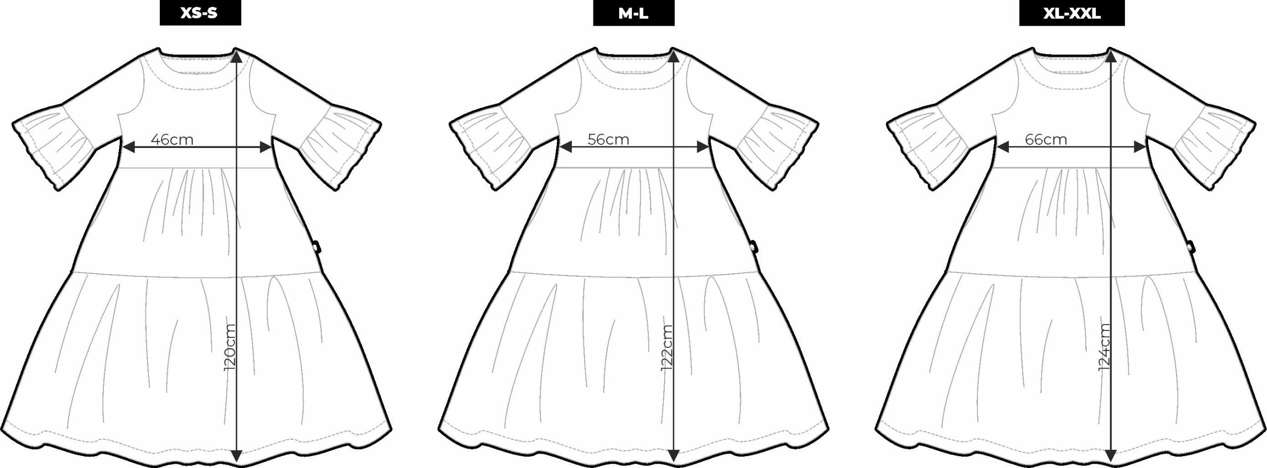 • Tuotteen pituus: 120cm(XS-S),  122cm(M-L) ja  124cm(XL-XXL). Kuvan mekon pituus olalta rinnan yli helmaan on 122cm.