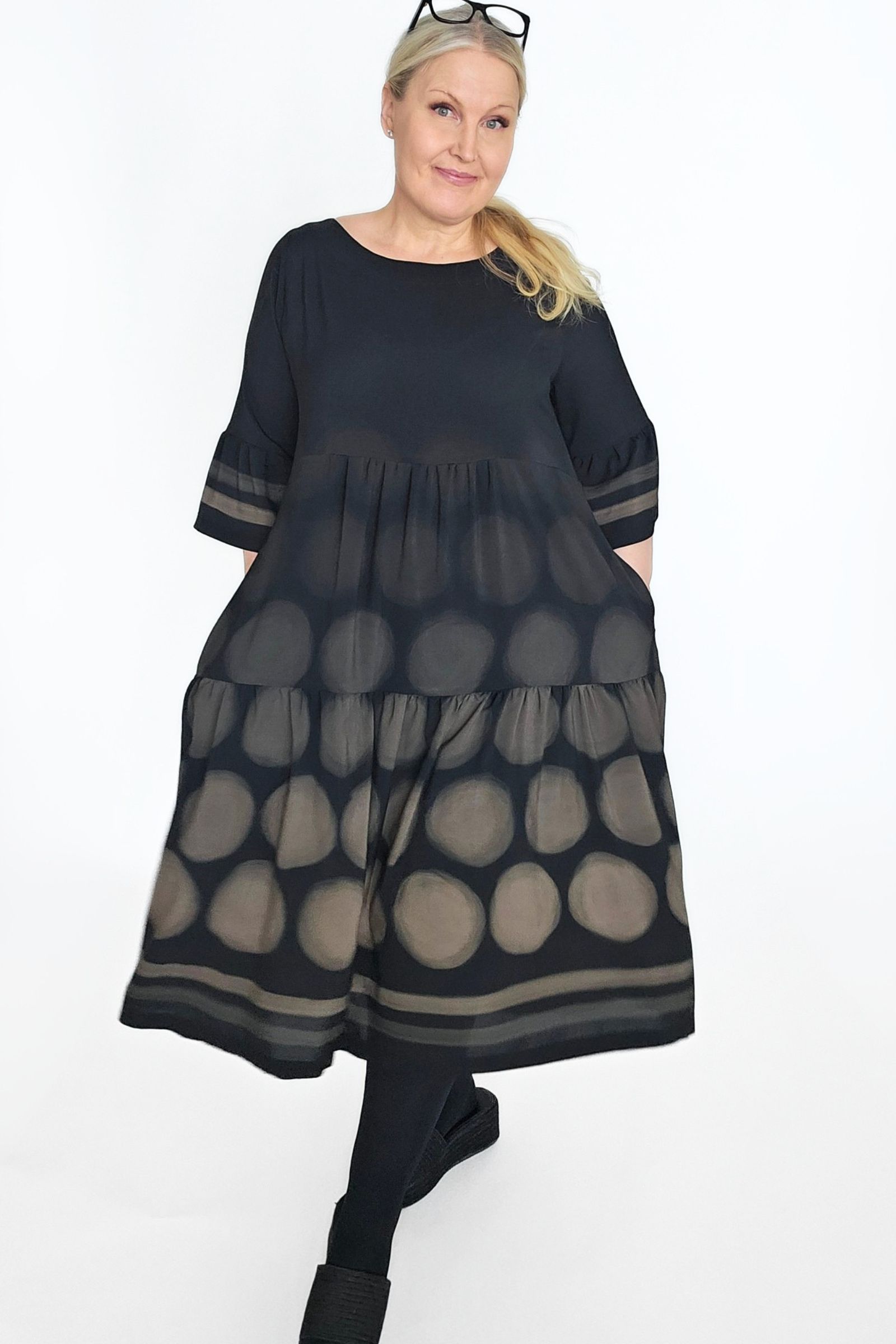 Poimuhelmainen ja -hihainen kerrosmekko utuisesta Kuunkajo-pallokuosista