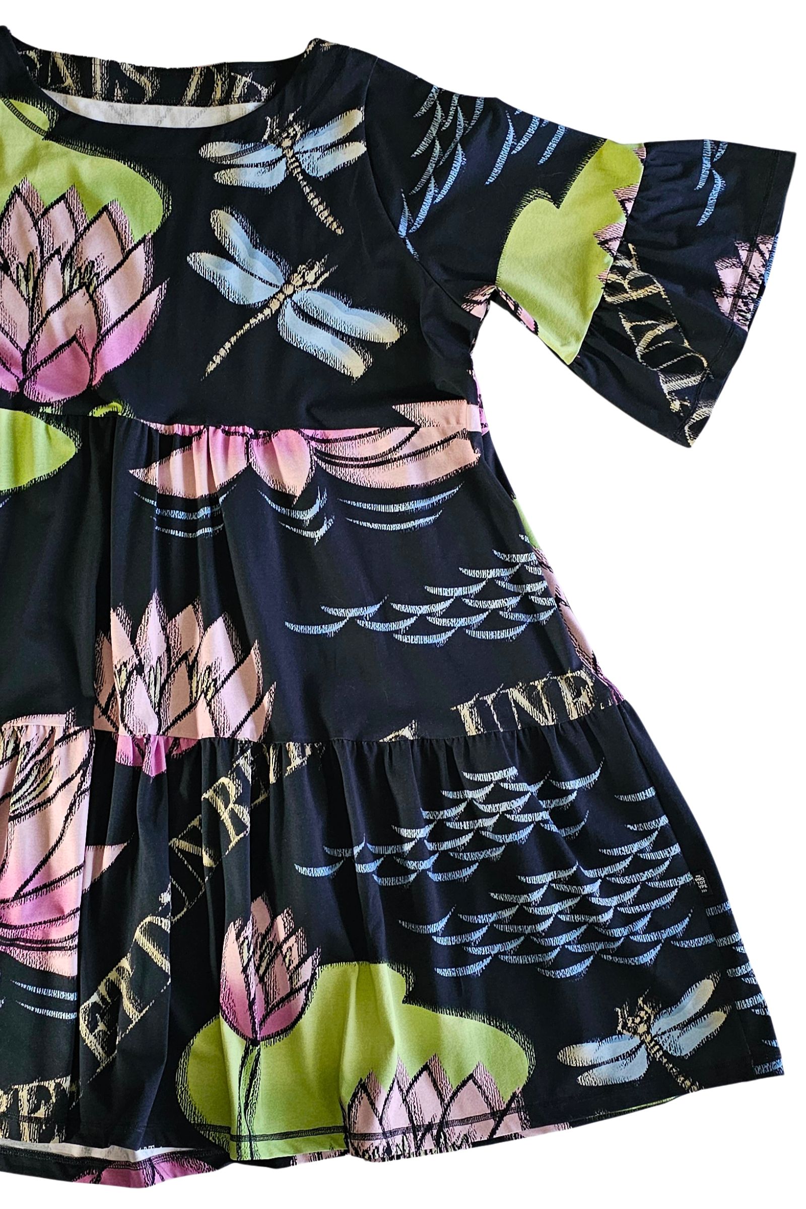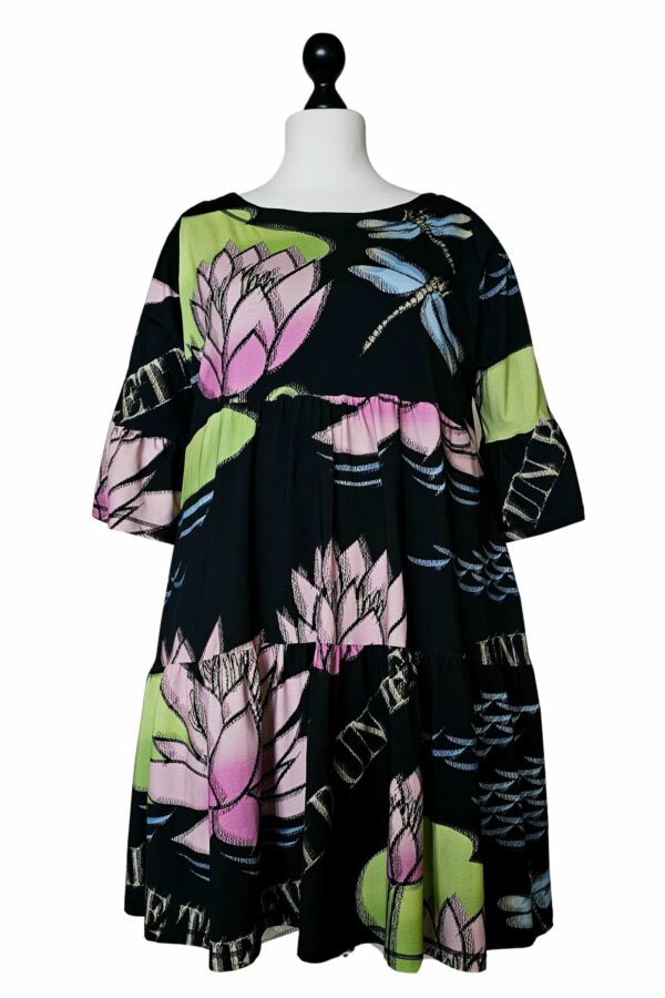 Kaunis poimu-kerroshelmainen A-linjainen mekko Lummelammella-trikoosta