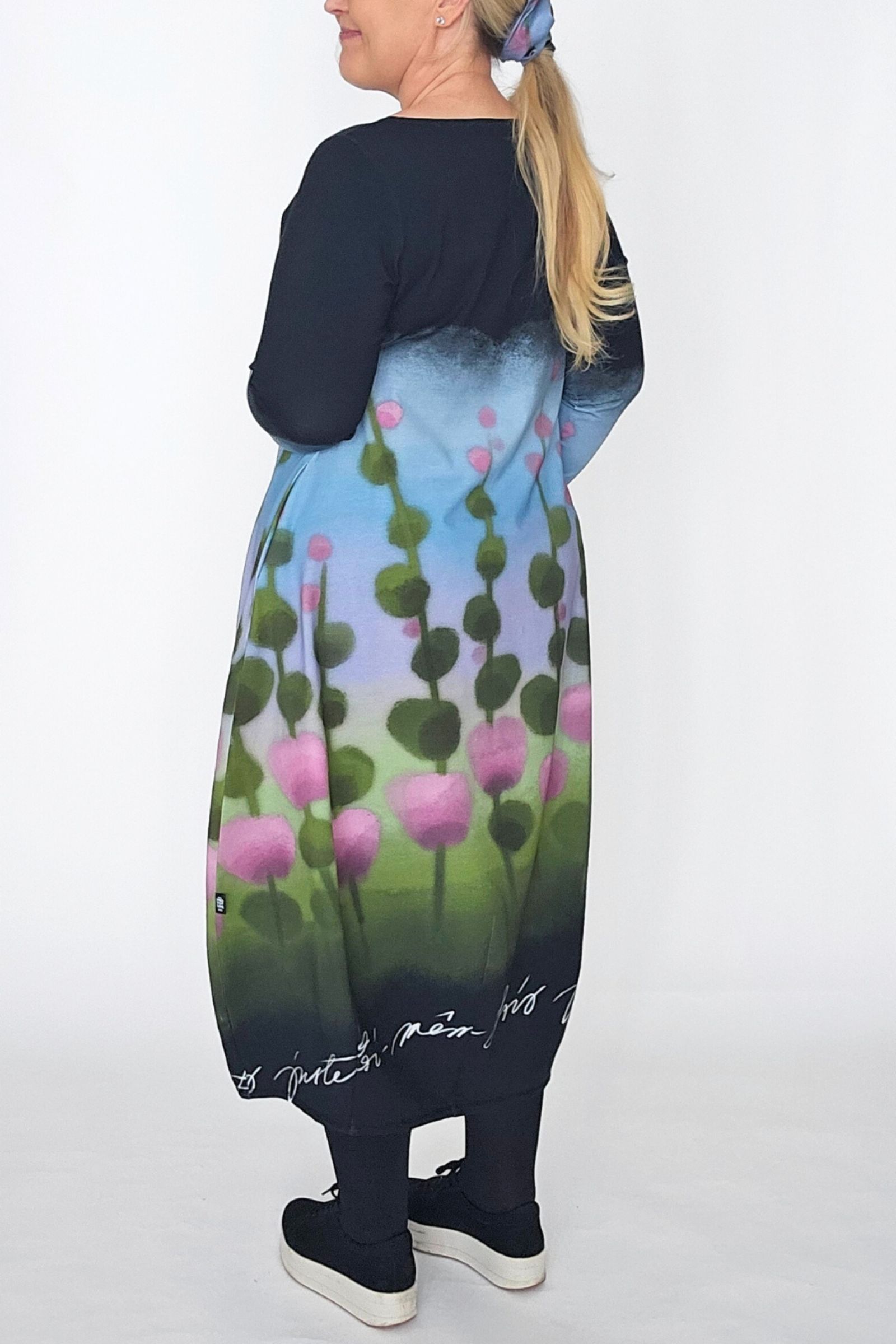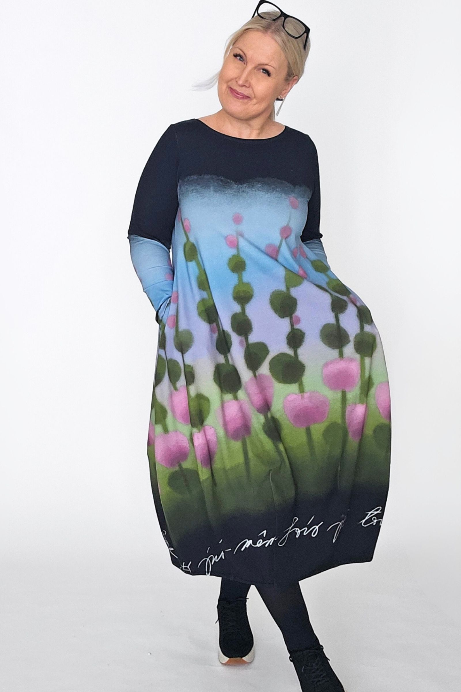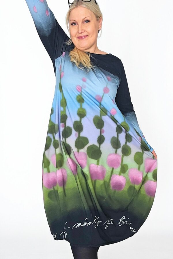 Kuvissa Marjukalla (RY:104cm, pituus 172cm) yllään Balloon-mekko kokoa 44.