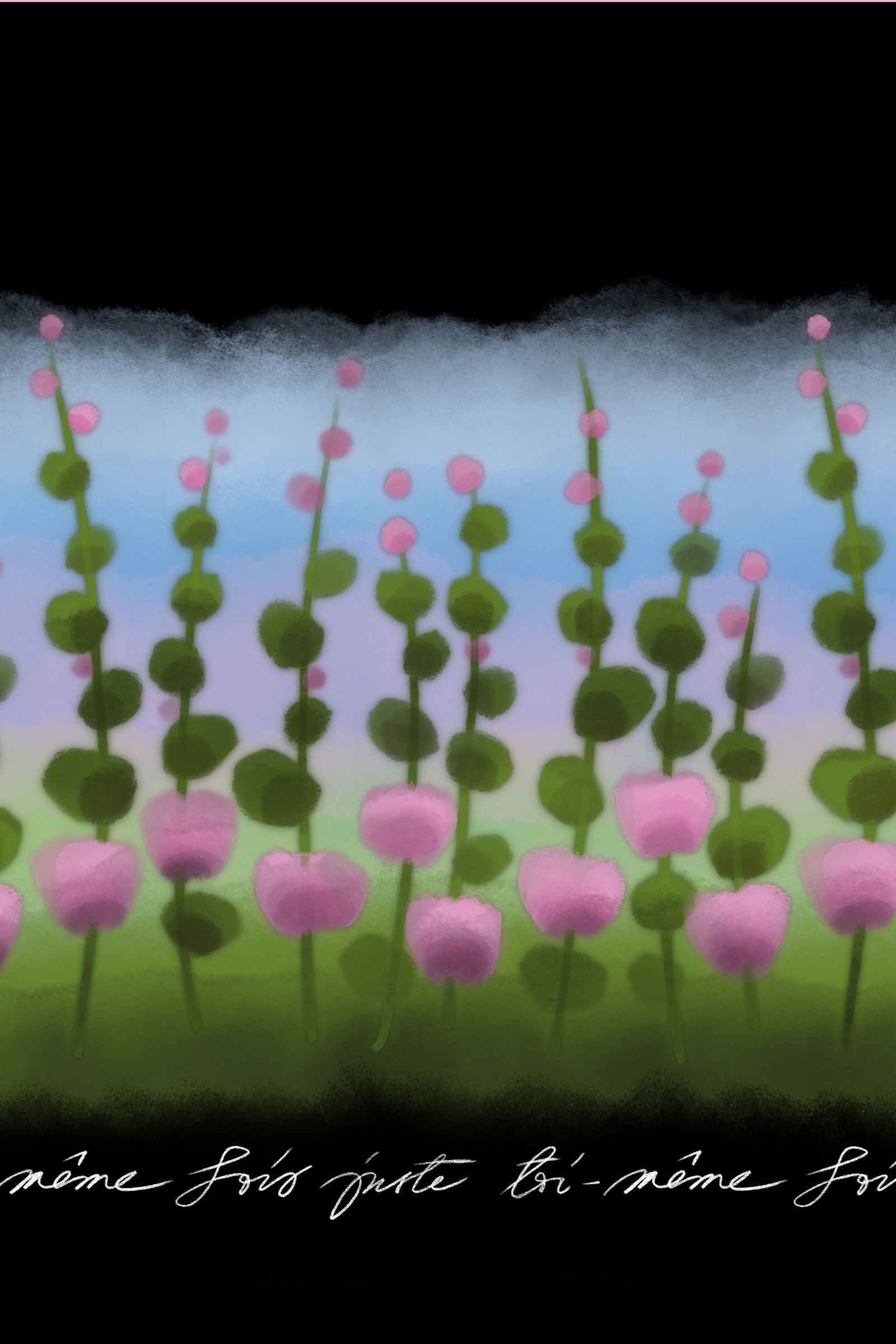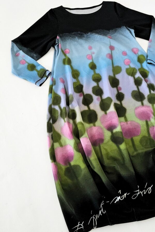 Siinä tyylitellyt roosat niittyapilat kukoistavat omenanvihreällä pellolla, johon taivaan sini heijastaa purppuraisen häivähdyksen. Kuosin pohjaväri on syvän musta.