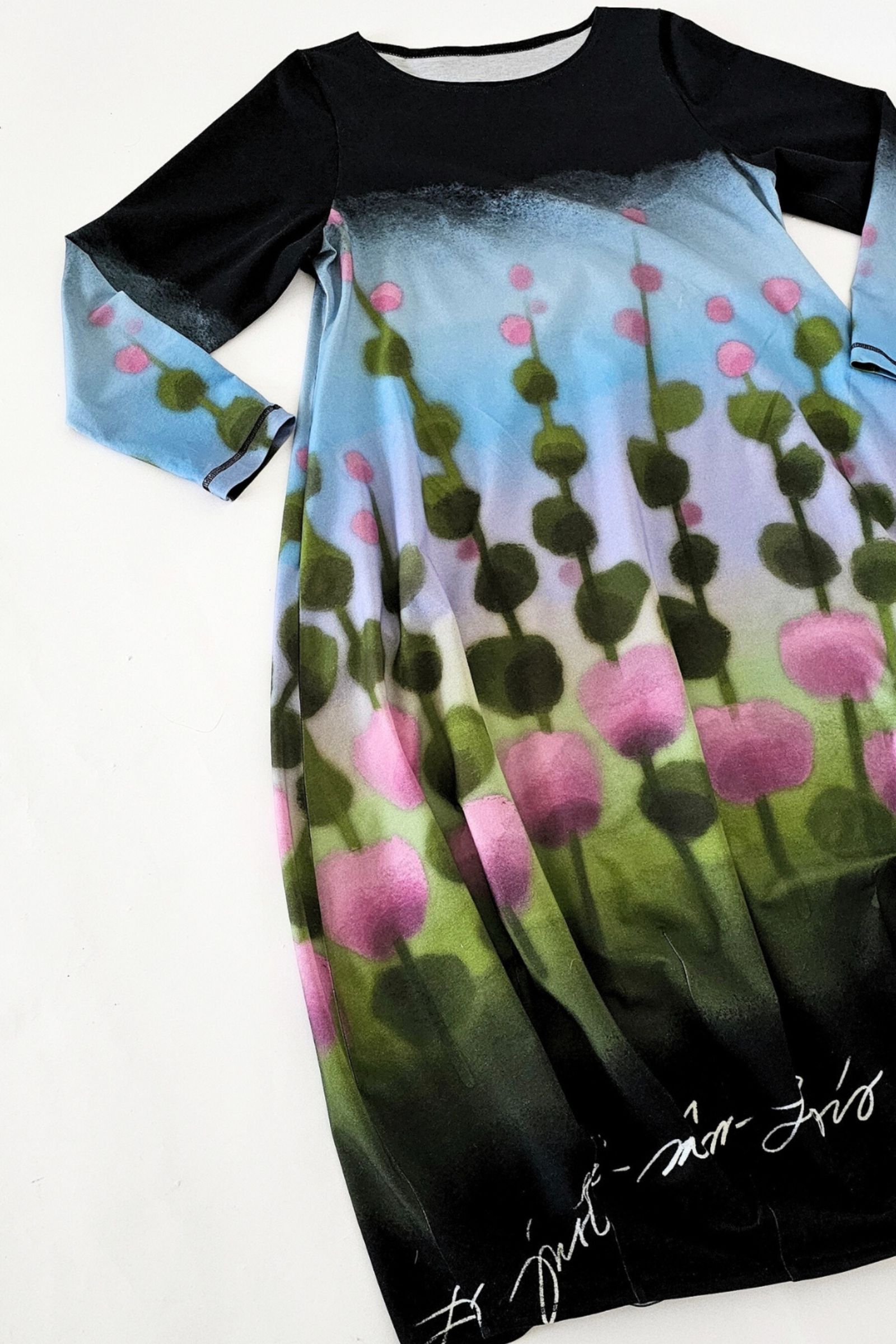 Niittyapila-kuosi on painettu puuvillatrikoolle. Mukavan napakan joustotrikoon leveys on n.160cm. Tämä puuvillatrikoo on painoltaan 220g, eli tämä on se MUTCATin raskaampi puuvillatrikoo👍. Kuosi on painettu digitaalisesti valkoiselle pohjalle, joten nurja puoli on vaaleampi kuin päällipuoli. Tummissa väreissä voi esiintyä paikoin neulanpään-kokoisia pohjavärisiä pisteitä, joita digiprintissä ei voi täysin estää. Pese, ja varsinkin linkoa varoen, että tämän digiprintin värit säilyvät pitkään uuden veroisina!