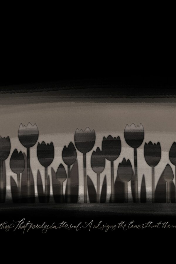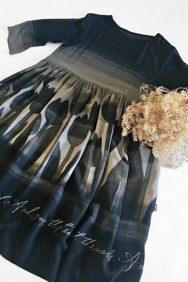 Sarastus-kuosissa päivä sarastaa pakkasyön jälkeen tulppaanipellolle. Käsinkirjoitettu englantilainen vanha runon katkelma soljuu huurteisen kukkaispellon alla. Pohjaväri on syvän musta, ja kuvioiden väreinä greigen ja ruskean sävyt.