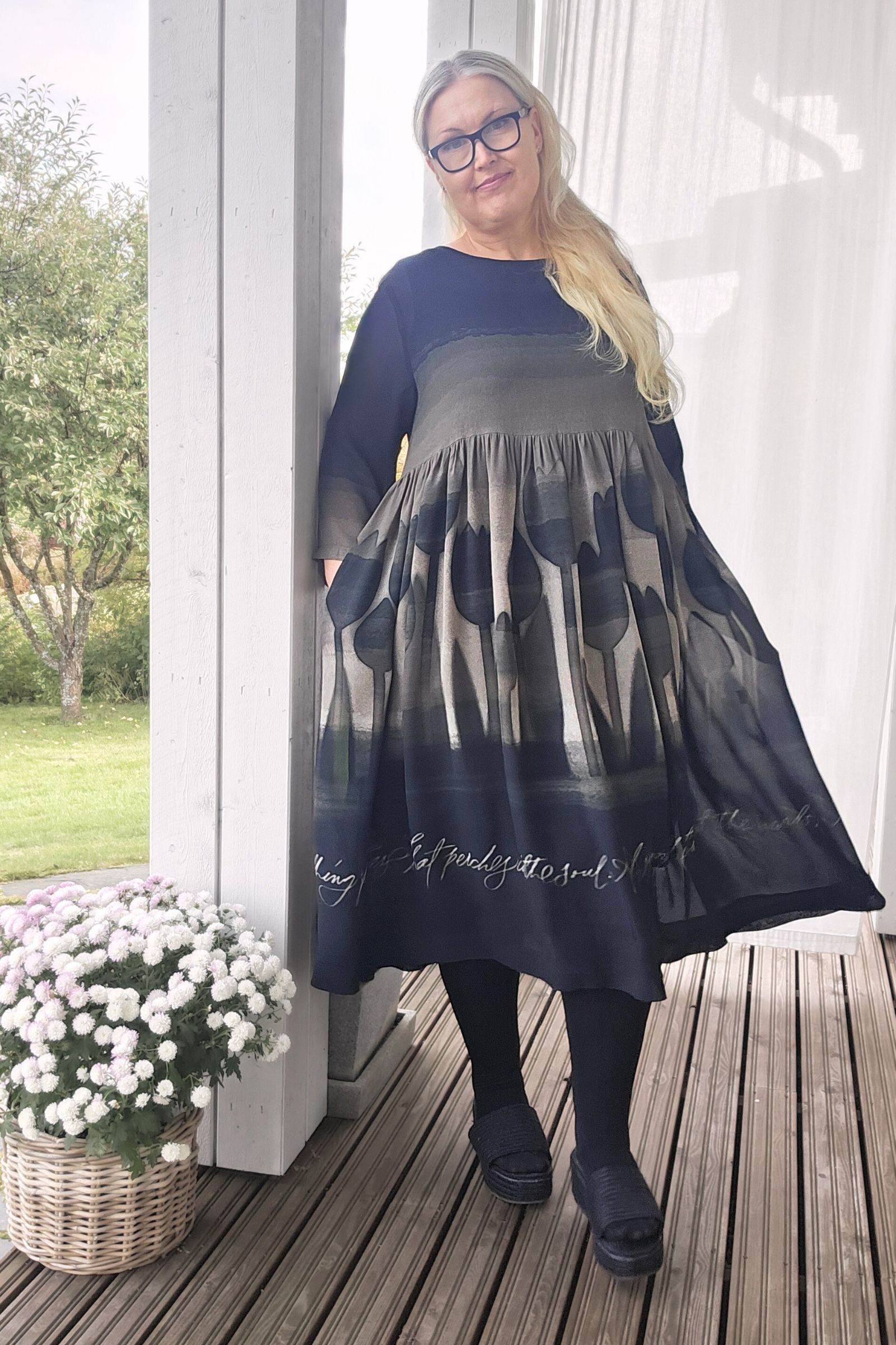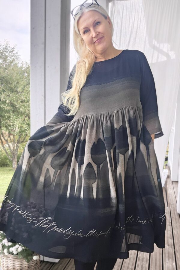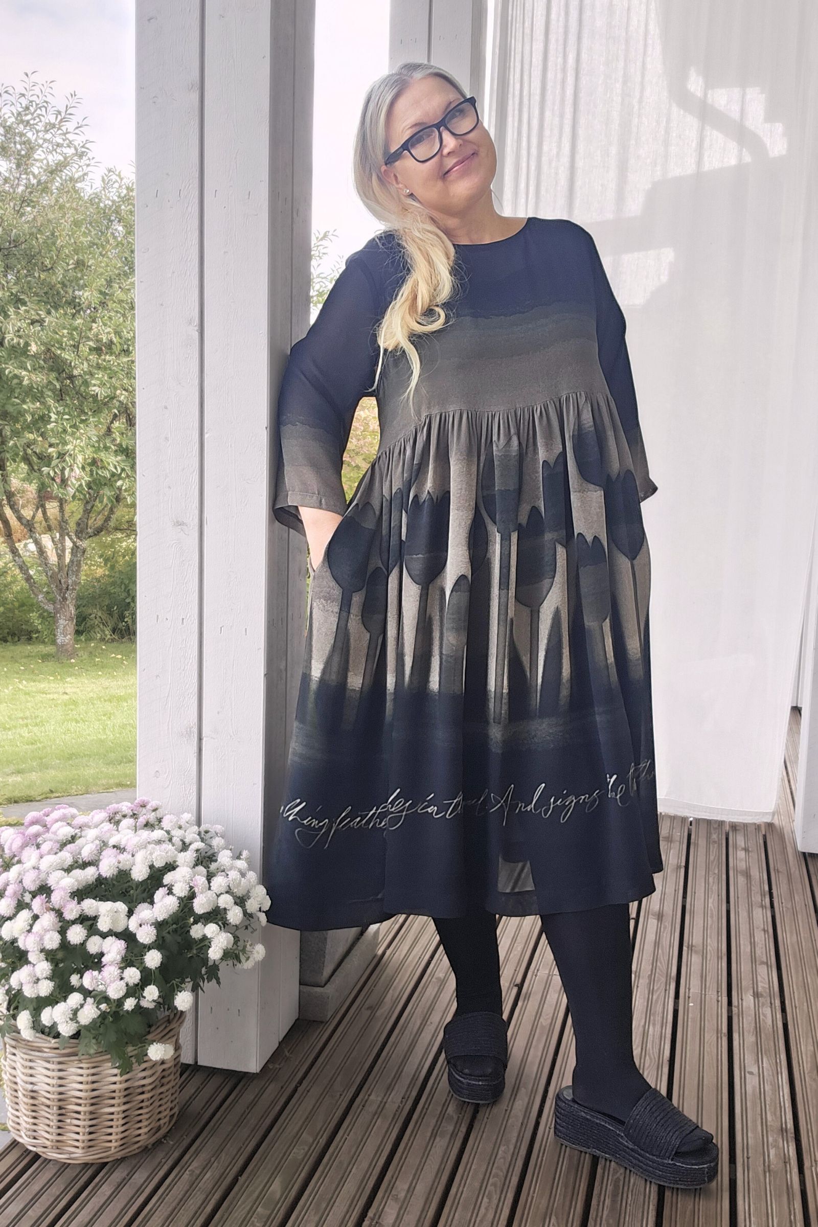 Kuvissa olen ommellut Sarastus raportti-georgettesta Delight-mekon, kaavan löydät täältä>. Koko on M, ja mallin rinnanympärys on 104cm.