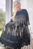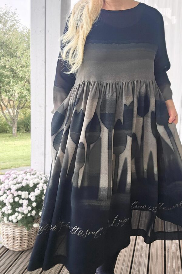 Läpikuultavuuden takia käytä georgetten alla joko mustaa alusmekkoa, tai suosi sitä osana kerrospukeutumista. Trikoinen alusmekko on tälle kankaalle ihan paras; itse ompelin mustasta lemppari-trikoosta (vi-ea) Friday-trikoomekkokaavalla> hihattoman alusmekon.