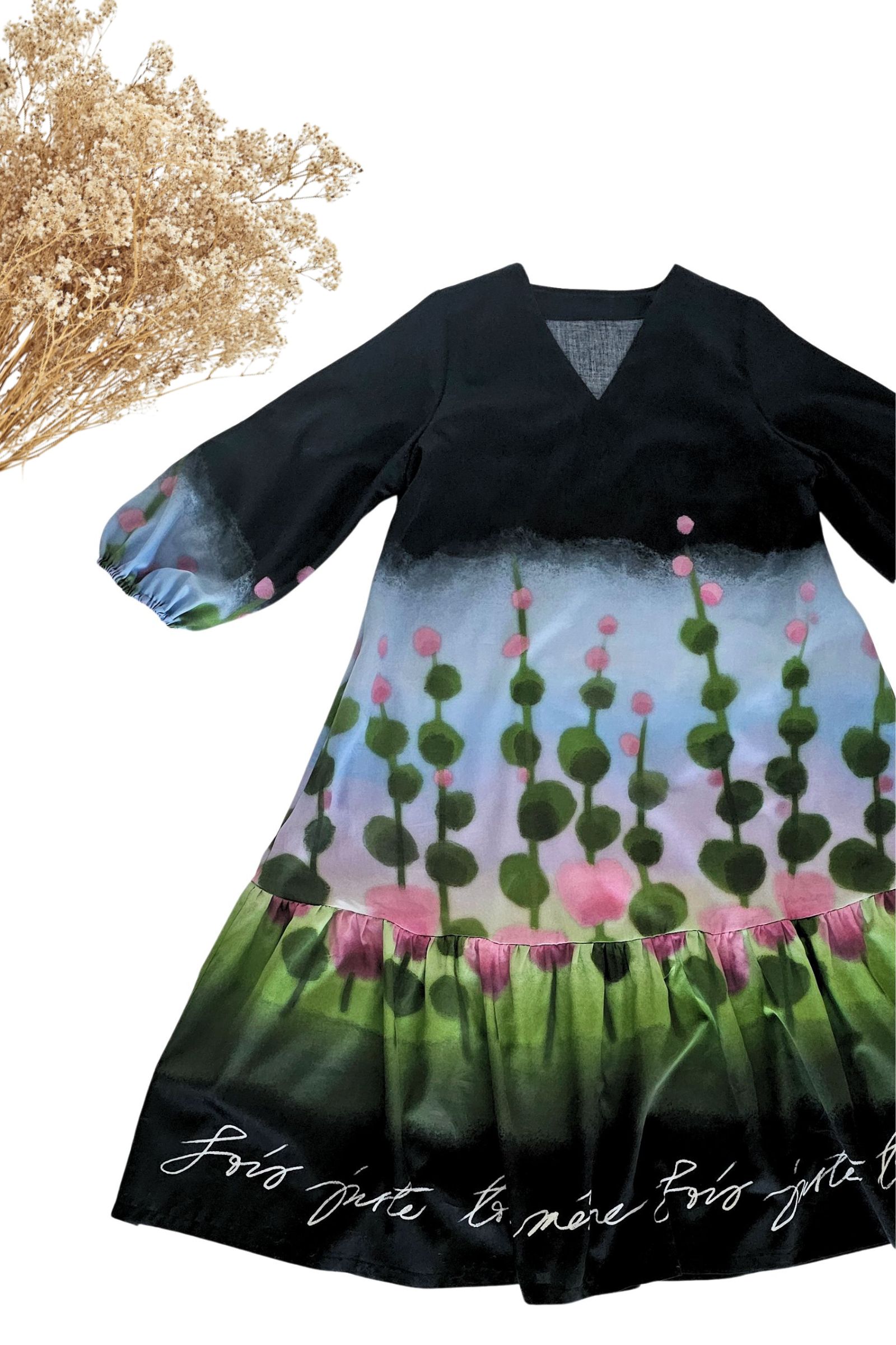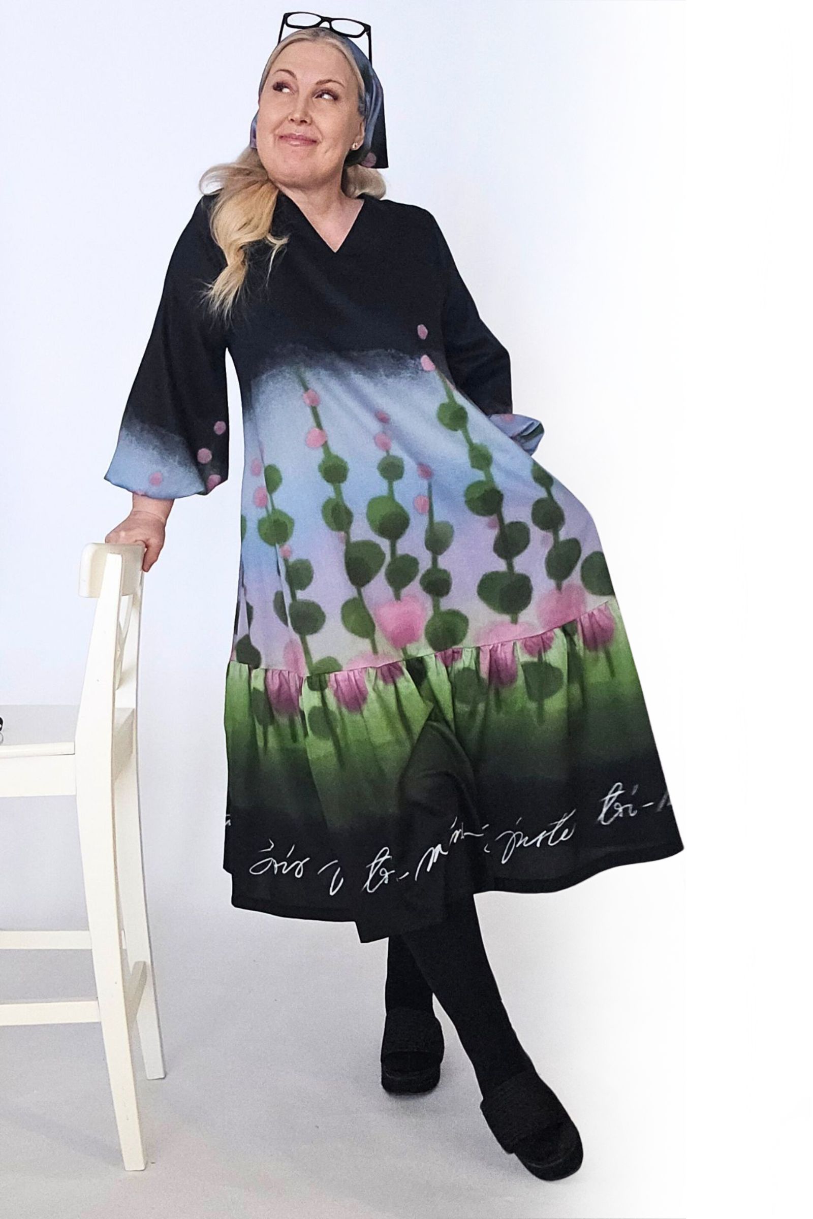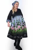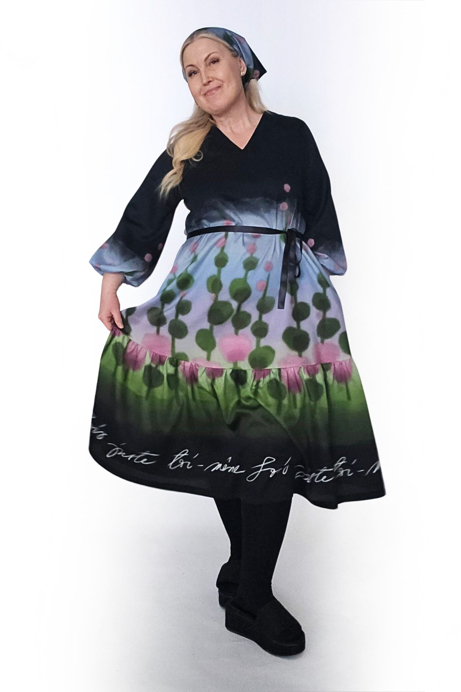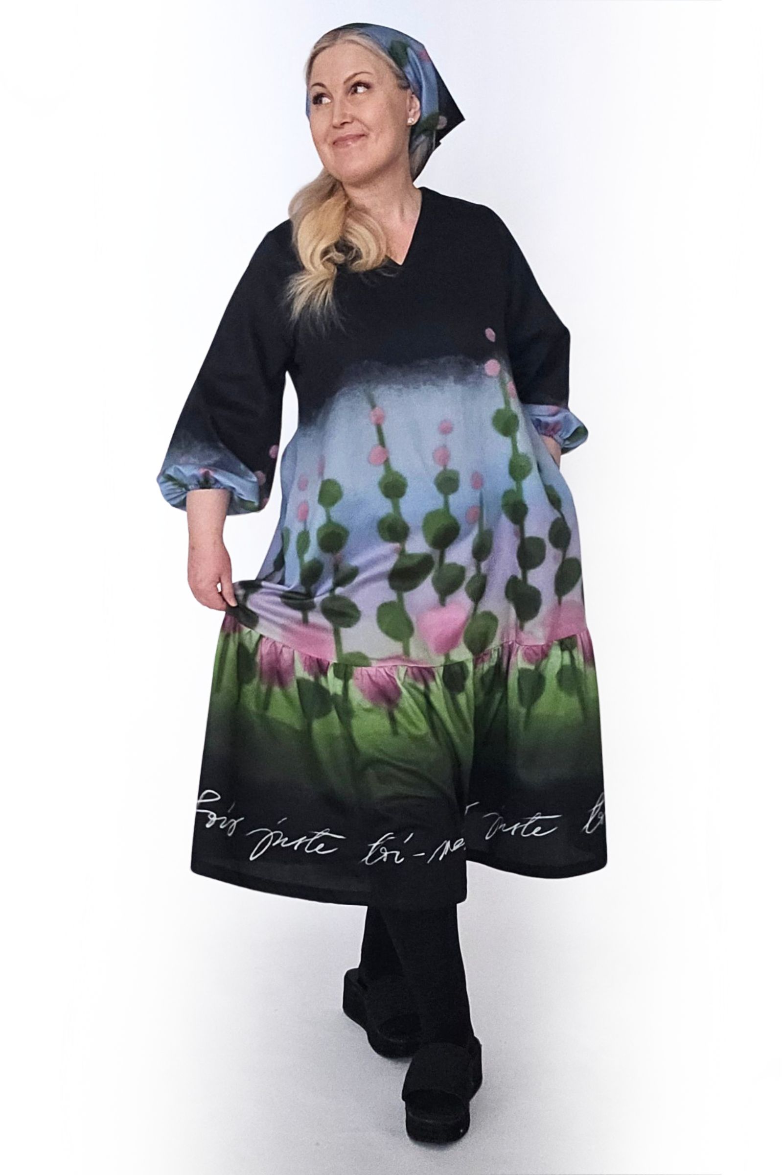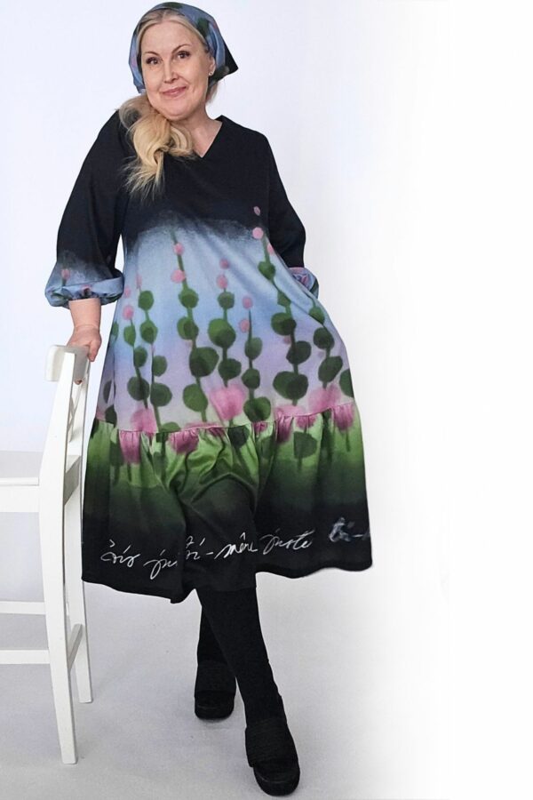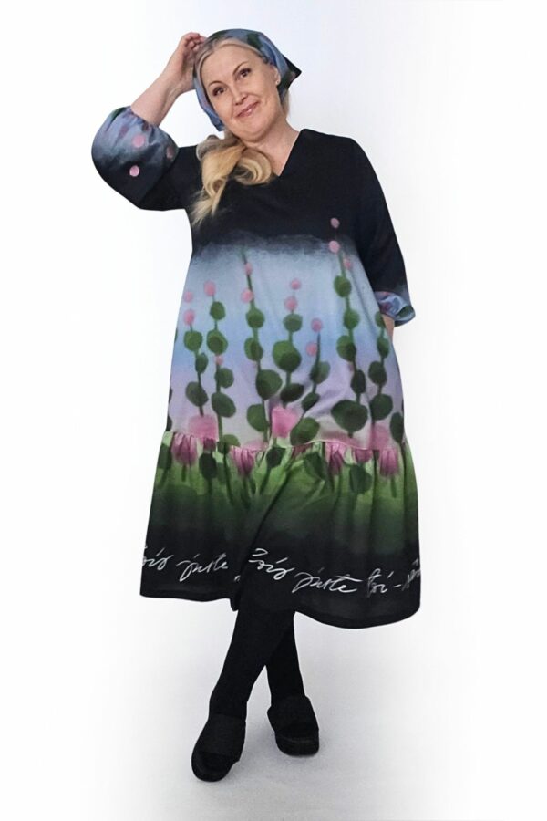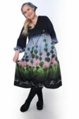 Tämä Serene-mekko on ommeltu maalauksellisen värikkäästä Niittyapila-kuosista, jossa roosat niittyapilat kukoistavat omenanvihreällä pellolla, ja johon taivaan sini heijastaa purppuraisen häivähdyksen. Kuosin pohjaväri on syvän musta.