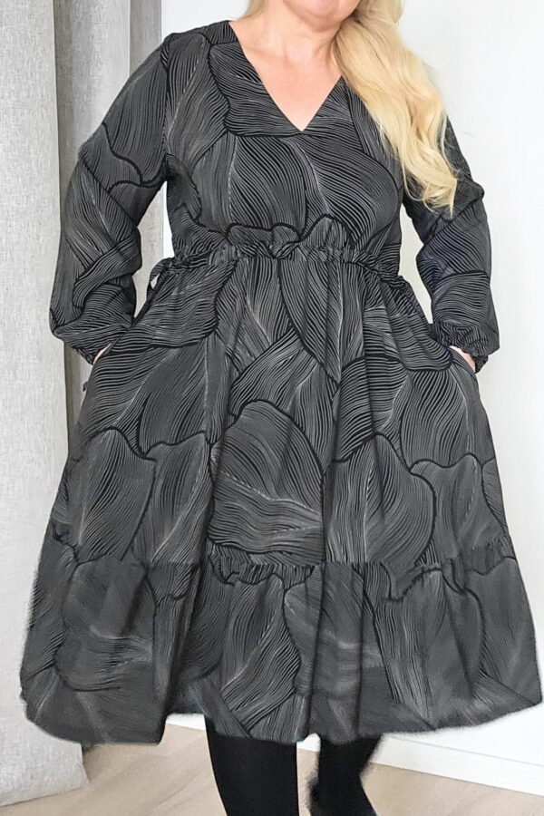 A-linjainen, poimuhelmainen pitkähihainen upea mekko, jossa v-pääntie. Taskut piilossa sivusaumoissa. Nauhakuja vyötäröllä.