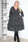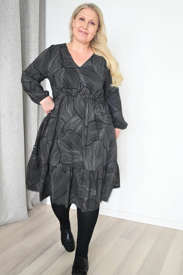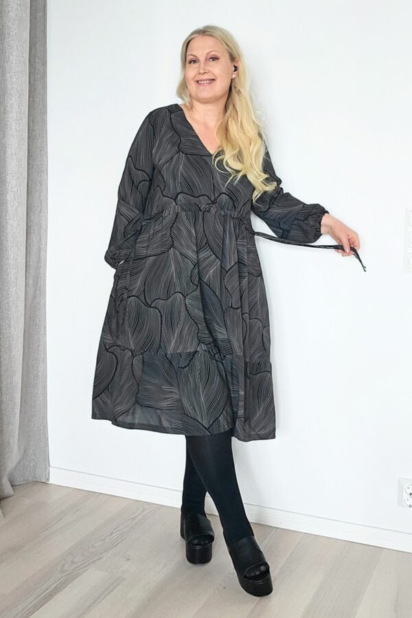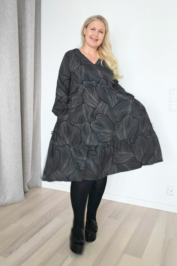 koot: XS-S-M-L-XL-XXL . Kuvissa Serene2.0-mekot Marjukan (RY:104cm, pituus 172cm) päällä ovat kokoa L, paitsi trikoinen musta mekko, ja Usva-kuosista ommeltu mekko ovat kokoa M. Alkuperäinen Serene-mekko tumman Karon (RY:85cm) päällä on kokoa S