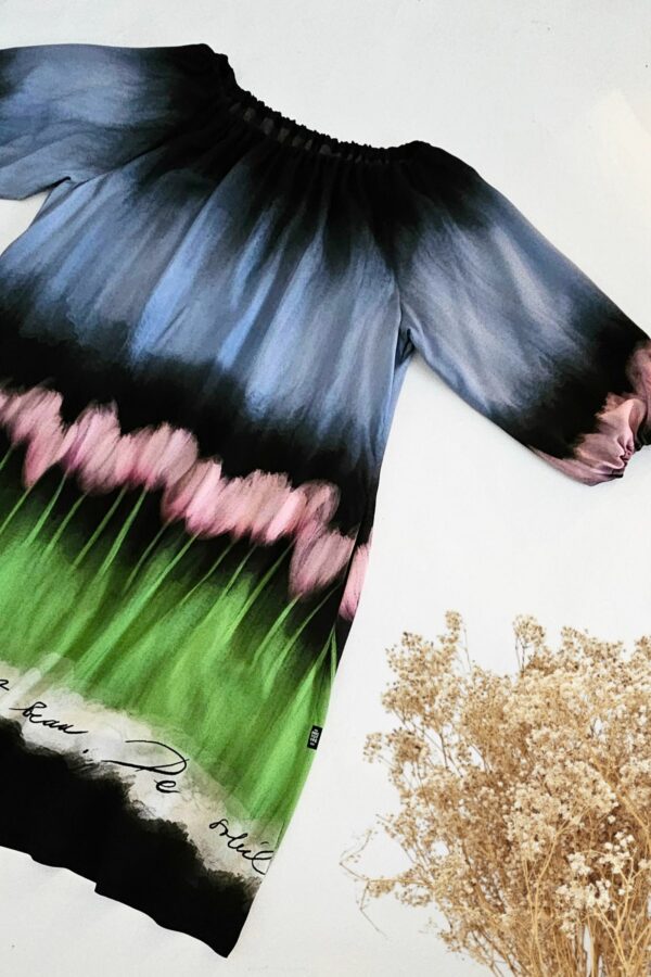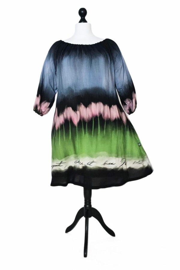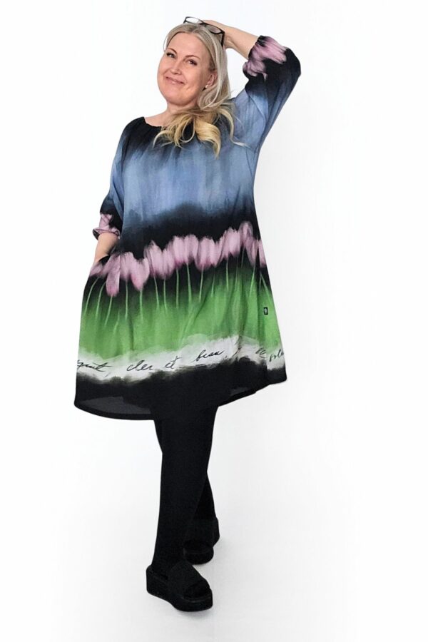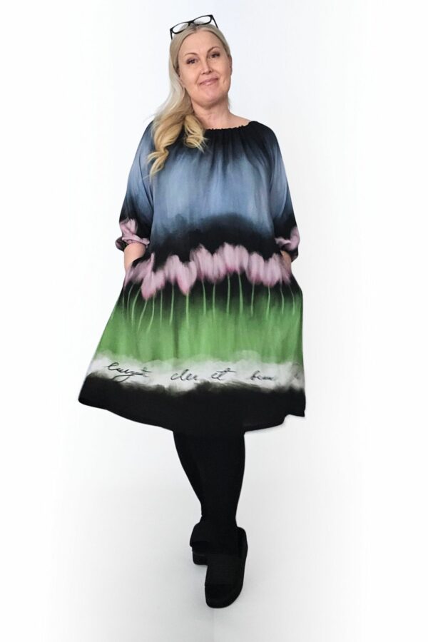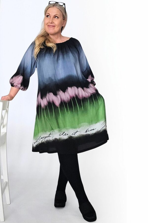 Mukava ja naisellinen, 3/4-raglahihainen mekko laskeutuvasta viskoosikankaasta. Mekon pääntiessä ja hihansuissa on kuminauhakuja-rypytykset. Sivusaumassa taskut.
