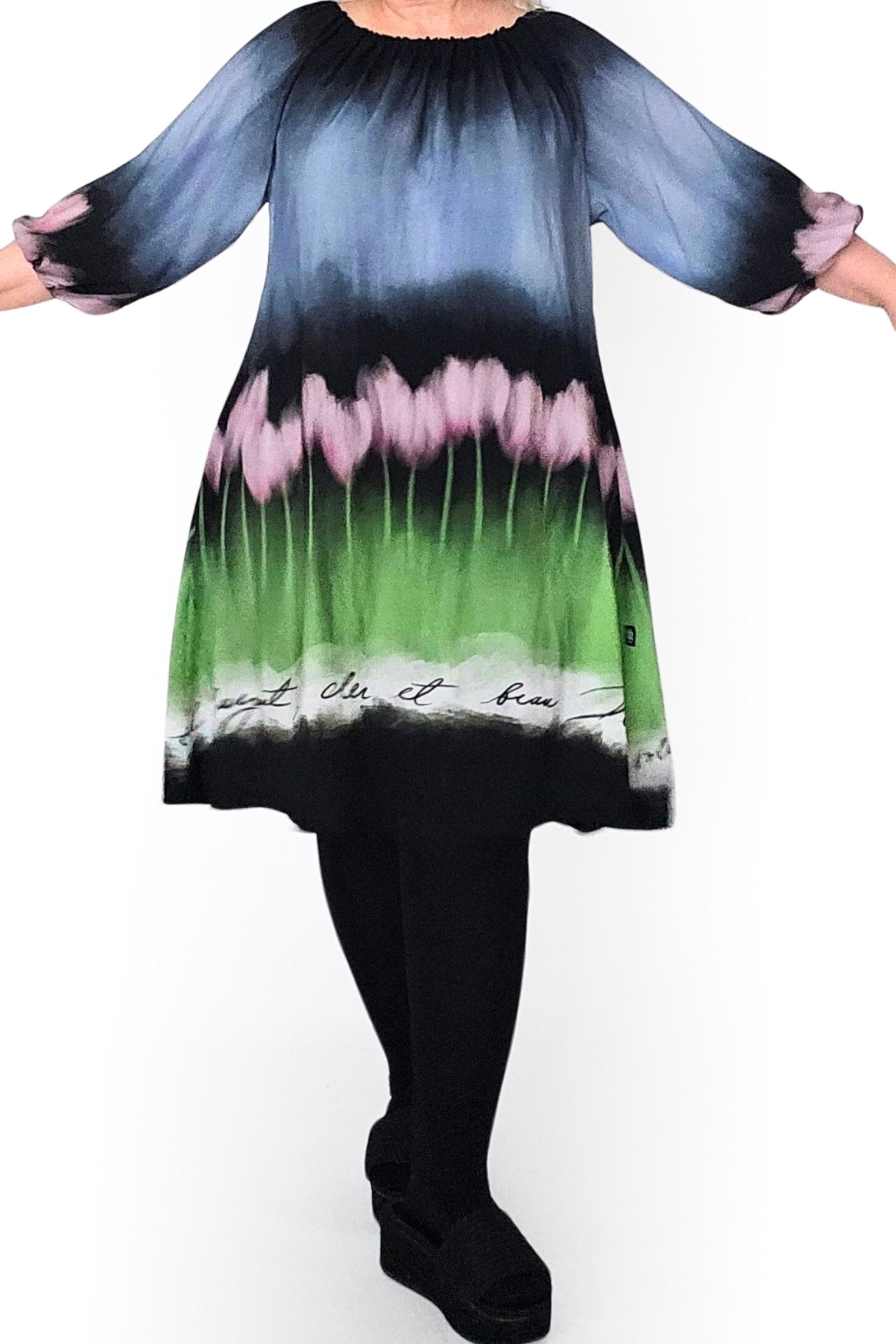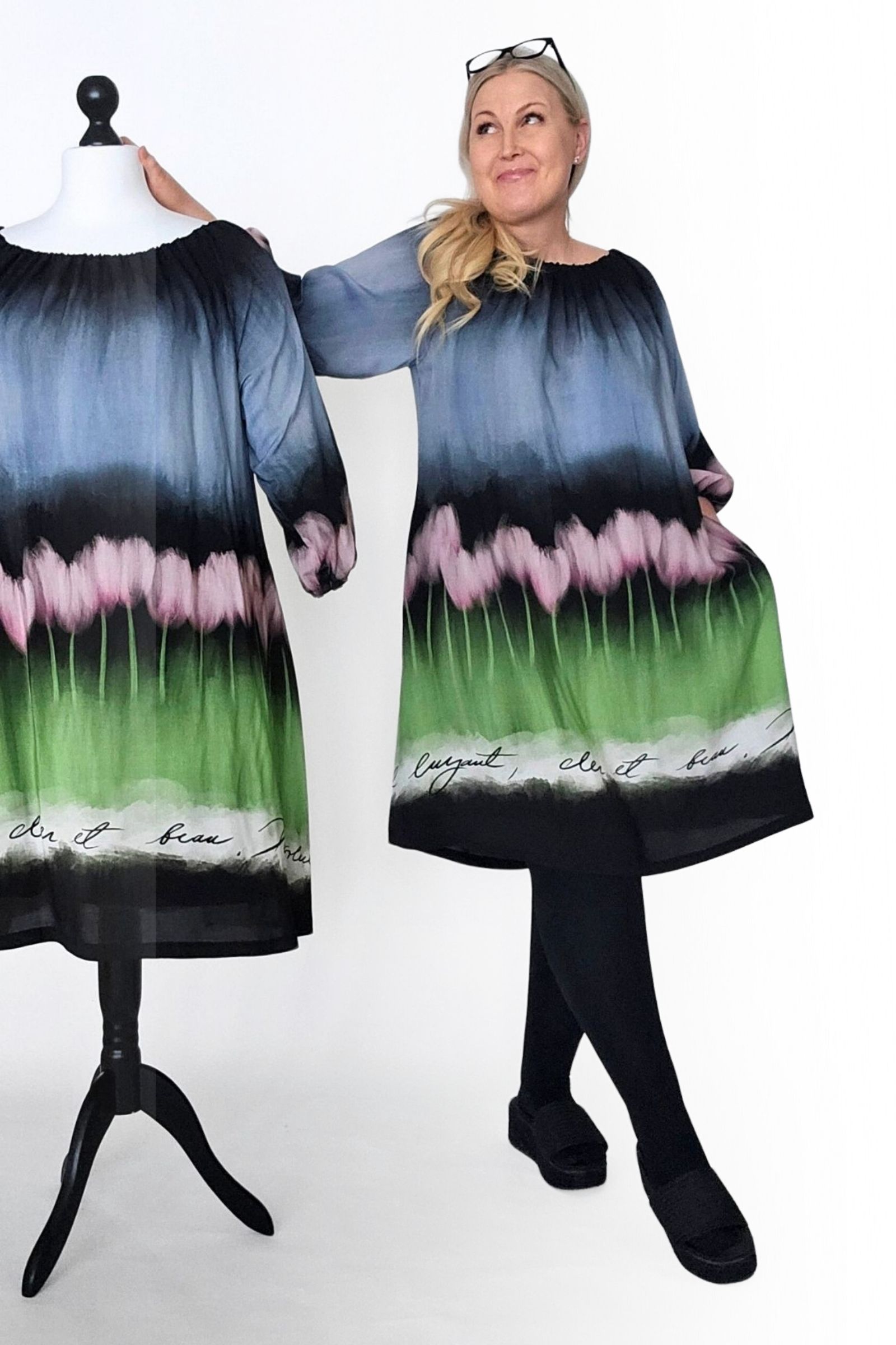Mukava ja naisellinen, 3/4-raglahihainen mekko laskeutuvasta viskoosikankaasta. Mekon pääntiessä ja hihansuissa on kuminauhakuja-rypytykset. Sivusaumassa taskut.