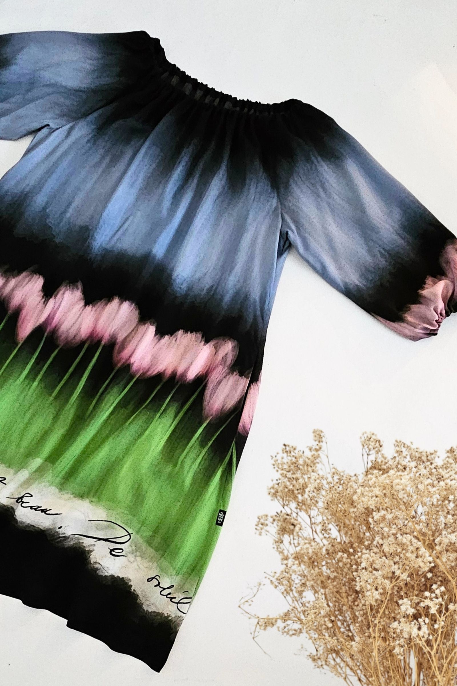 Tulppaanit-raporttiviskoosissa aamun sumuinen tulppaanipelto heräilee alkavaan päivään. Tulppaanien alla juokseva ranskalainen teksti ihastelee auringon valoa. Pohjaväri on syvän musta, ja kuvioiden värit vihreä, pinkki ja vaalea sininen.