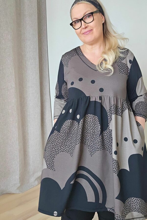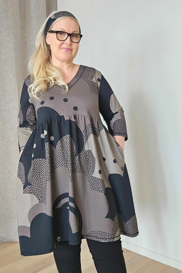 Tässä tunikamekossa on v-pääntie, jossa alavara, rinnan alta alkava poimutettu helma, reilut 3/4-hihat , ja taskut sivusaumoissa.