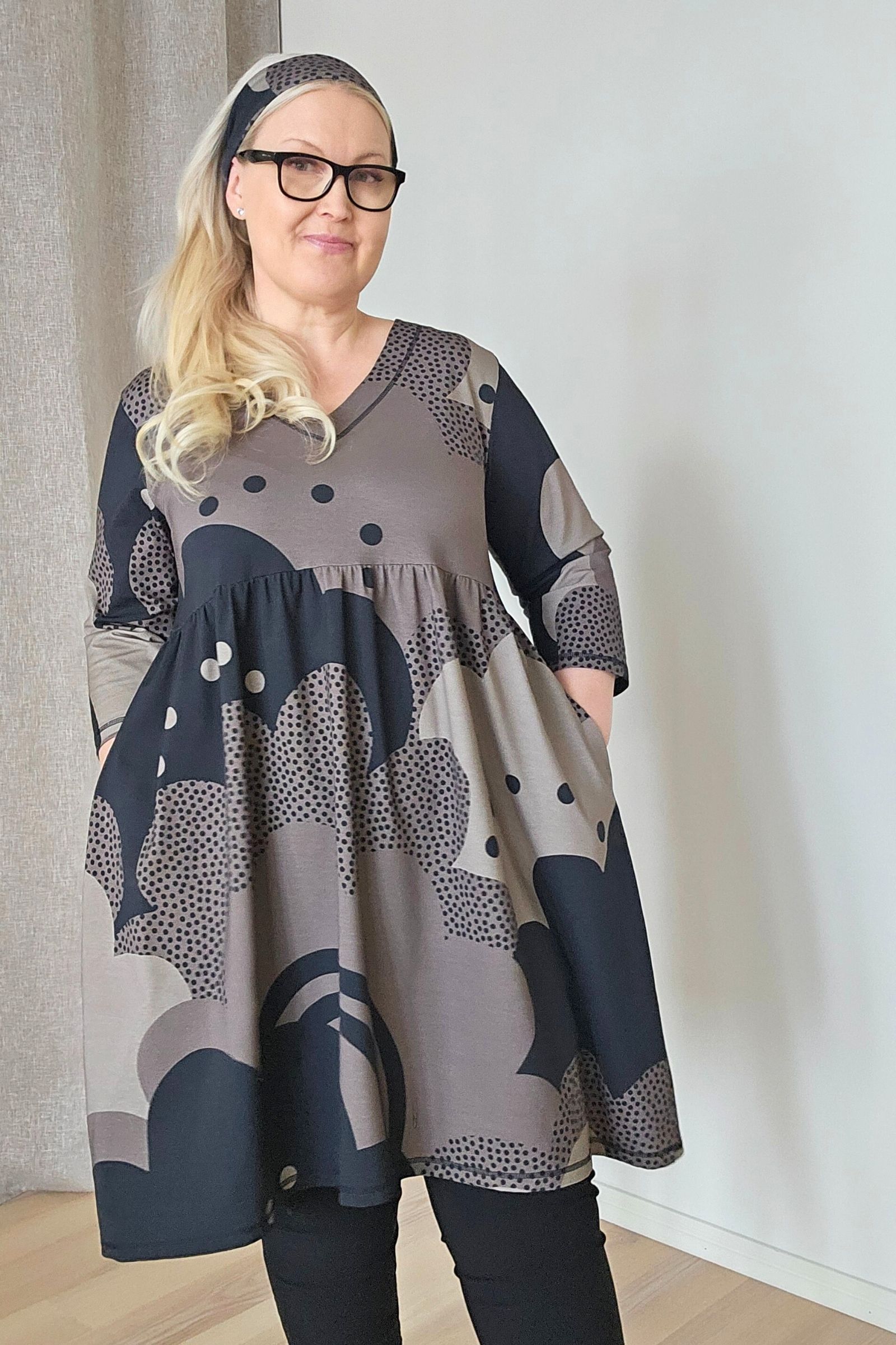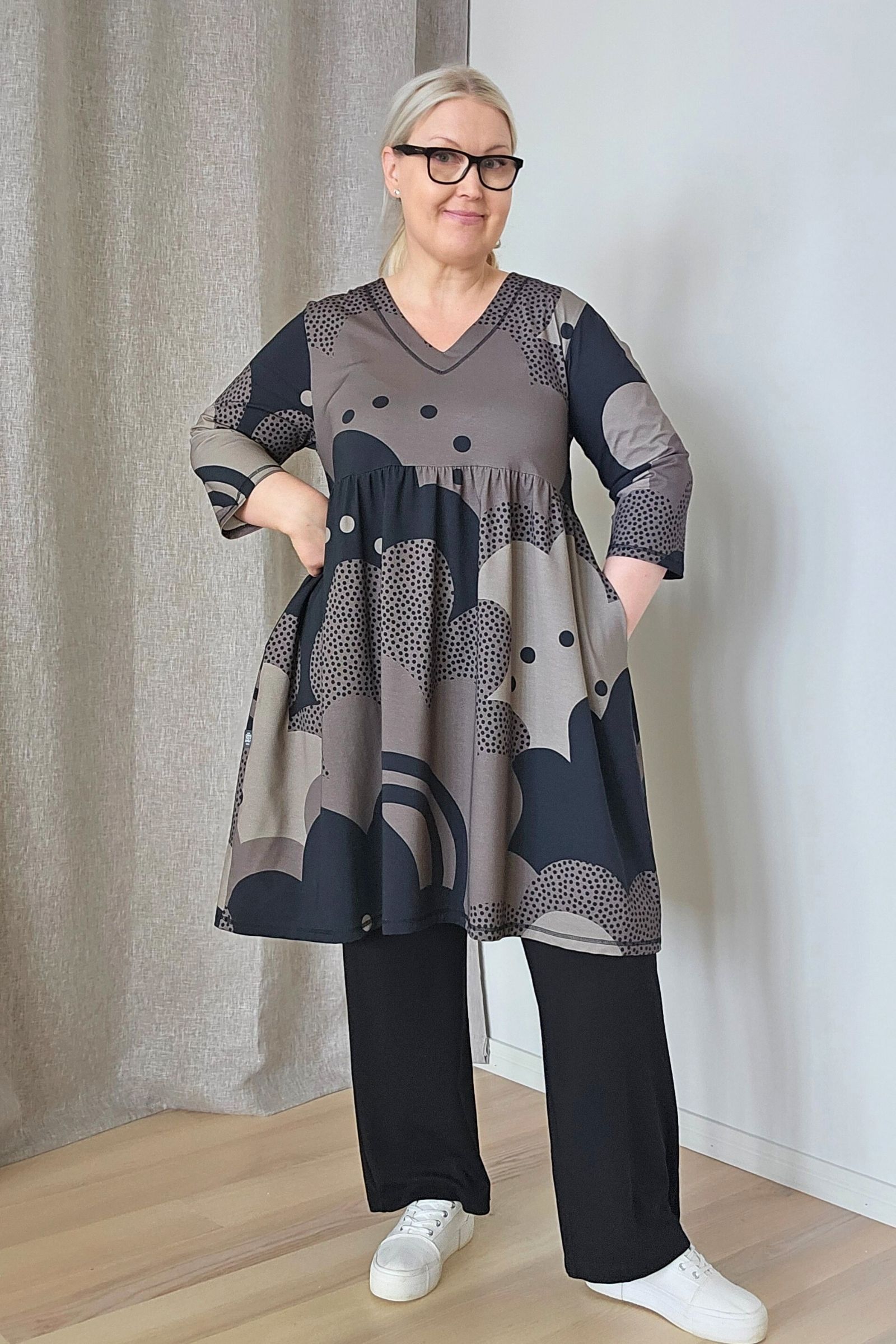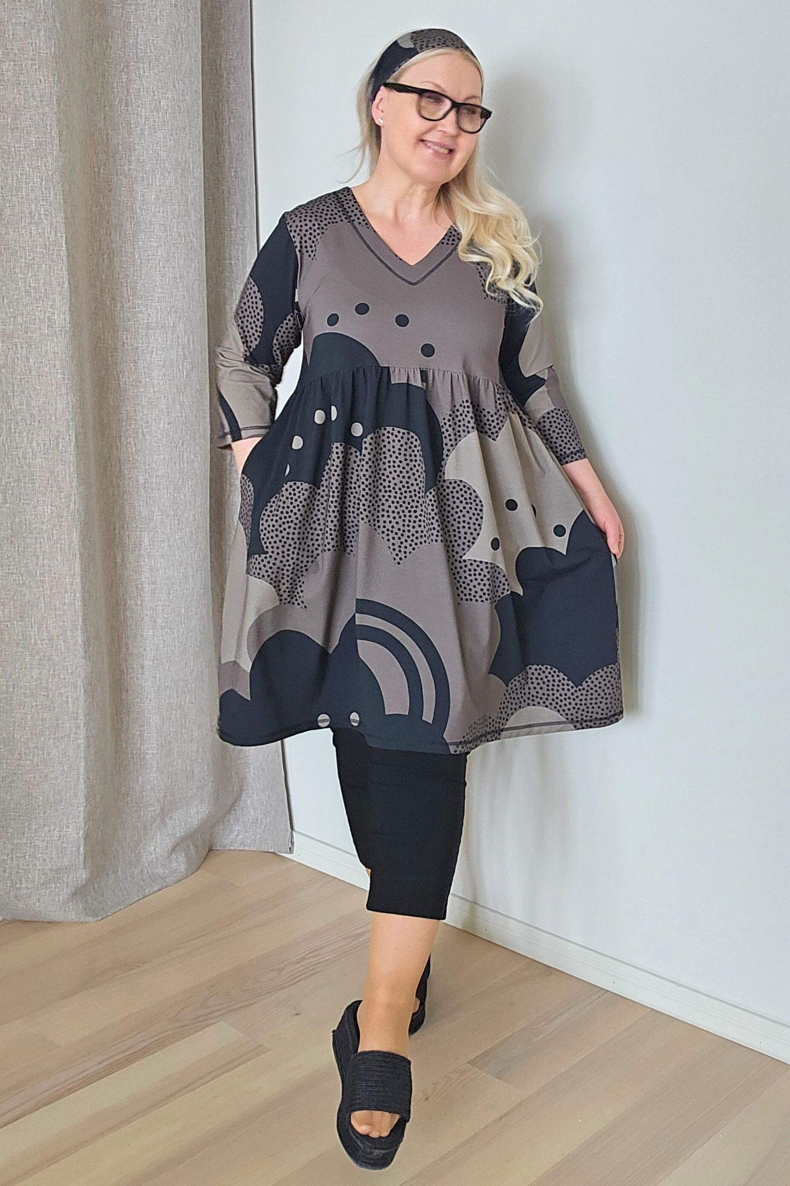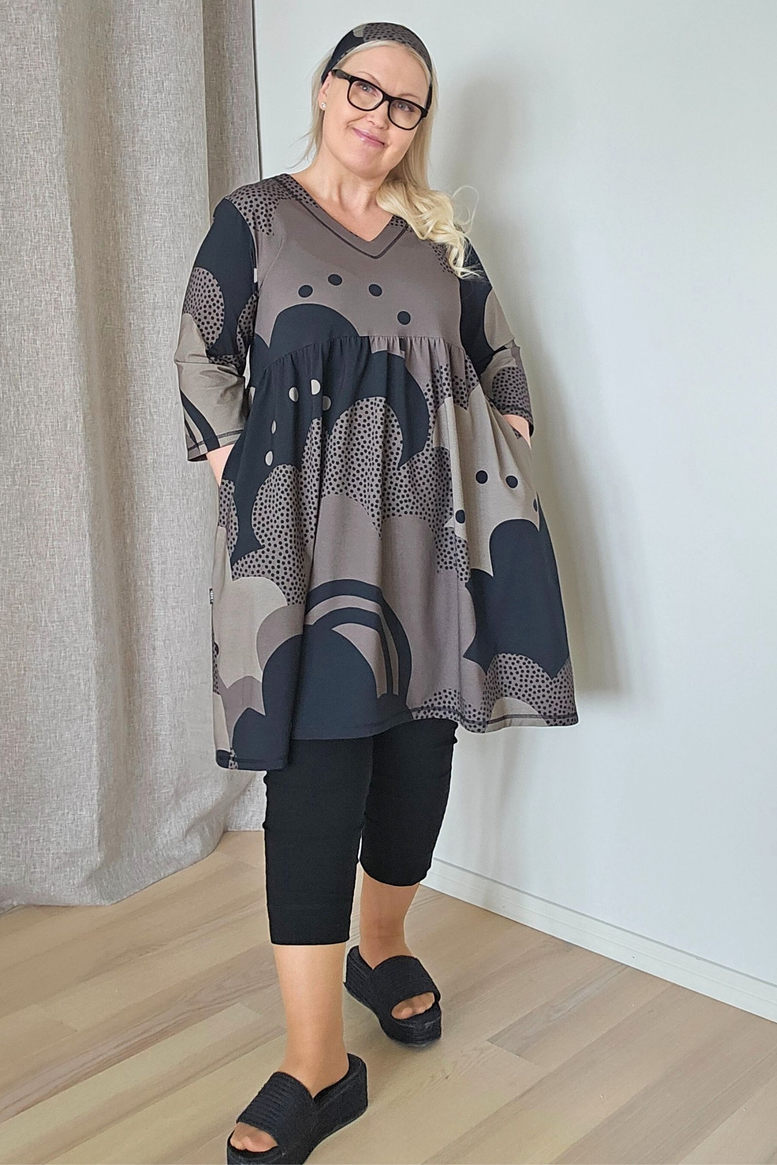 Tässä tunikamekossa on v-pääntie, jossa alavara, rinnan alta alkava poimutettu helma, reilut 3/4-hihat , ja taskut sivusaumoissa.