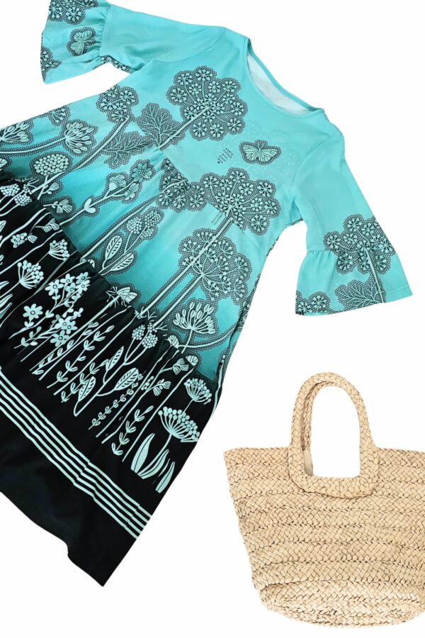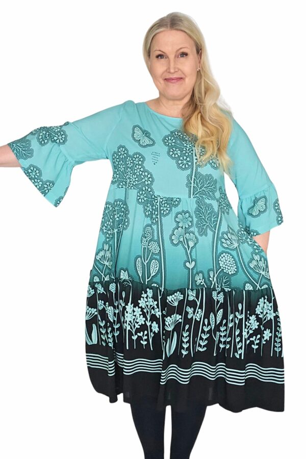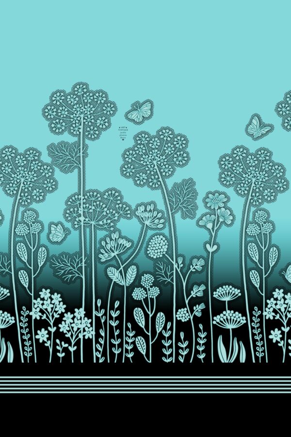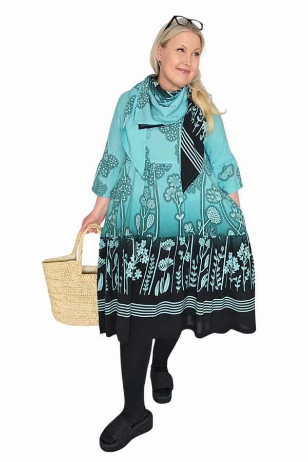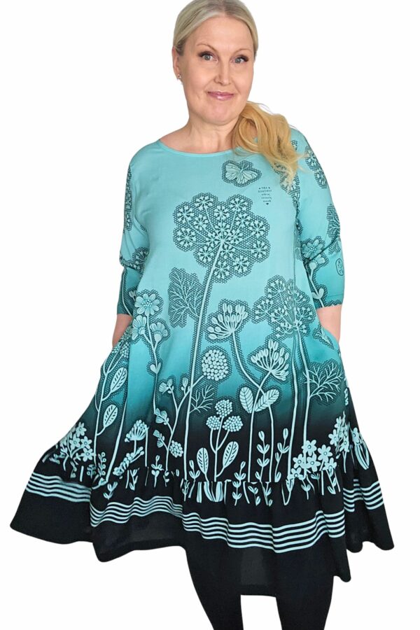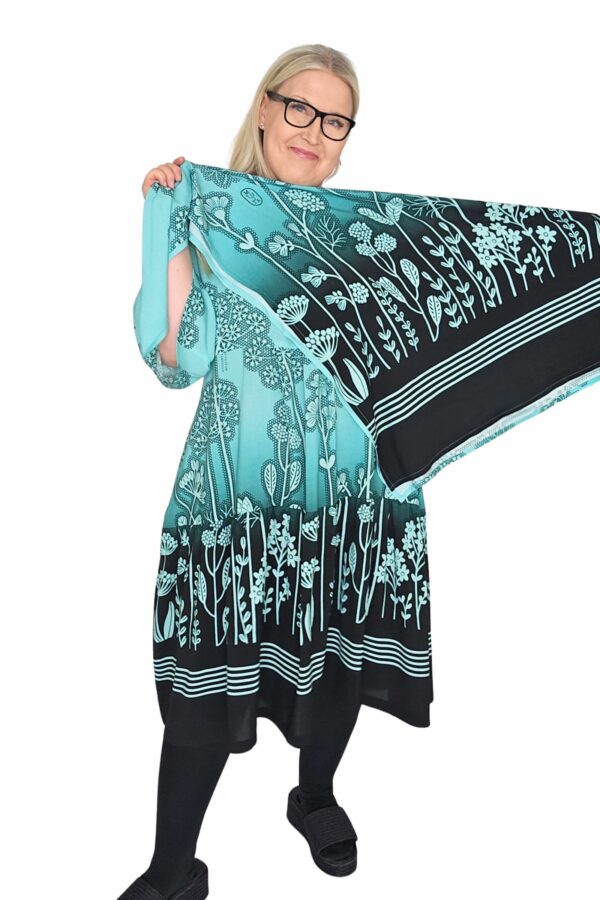 Kuosissa on kaunis vaalean turkoosi kuvio ja pohjaväri, jossa musta liukuu vähitellen petrolista turkoosiksi.