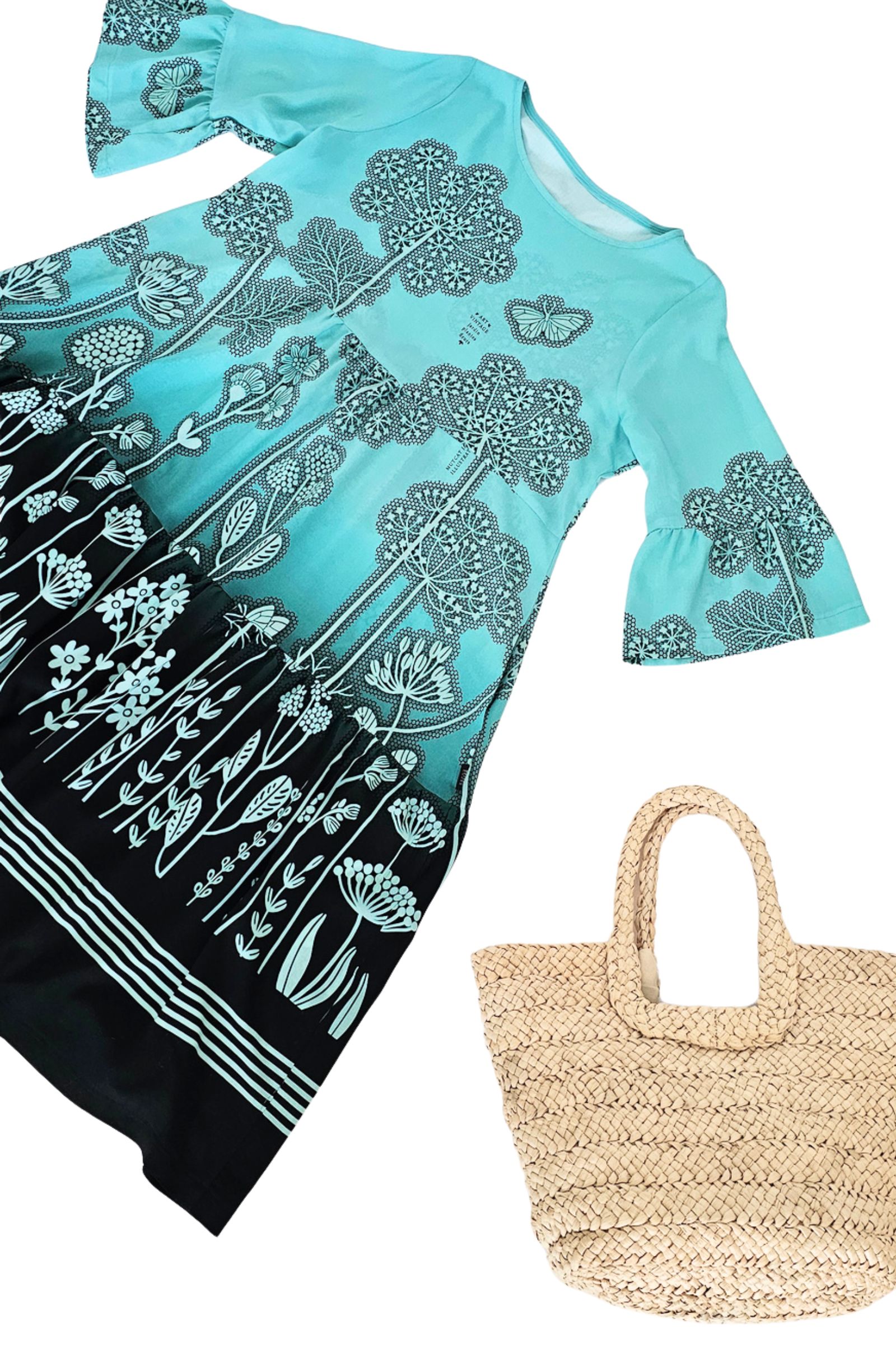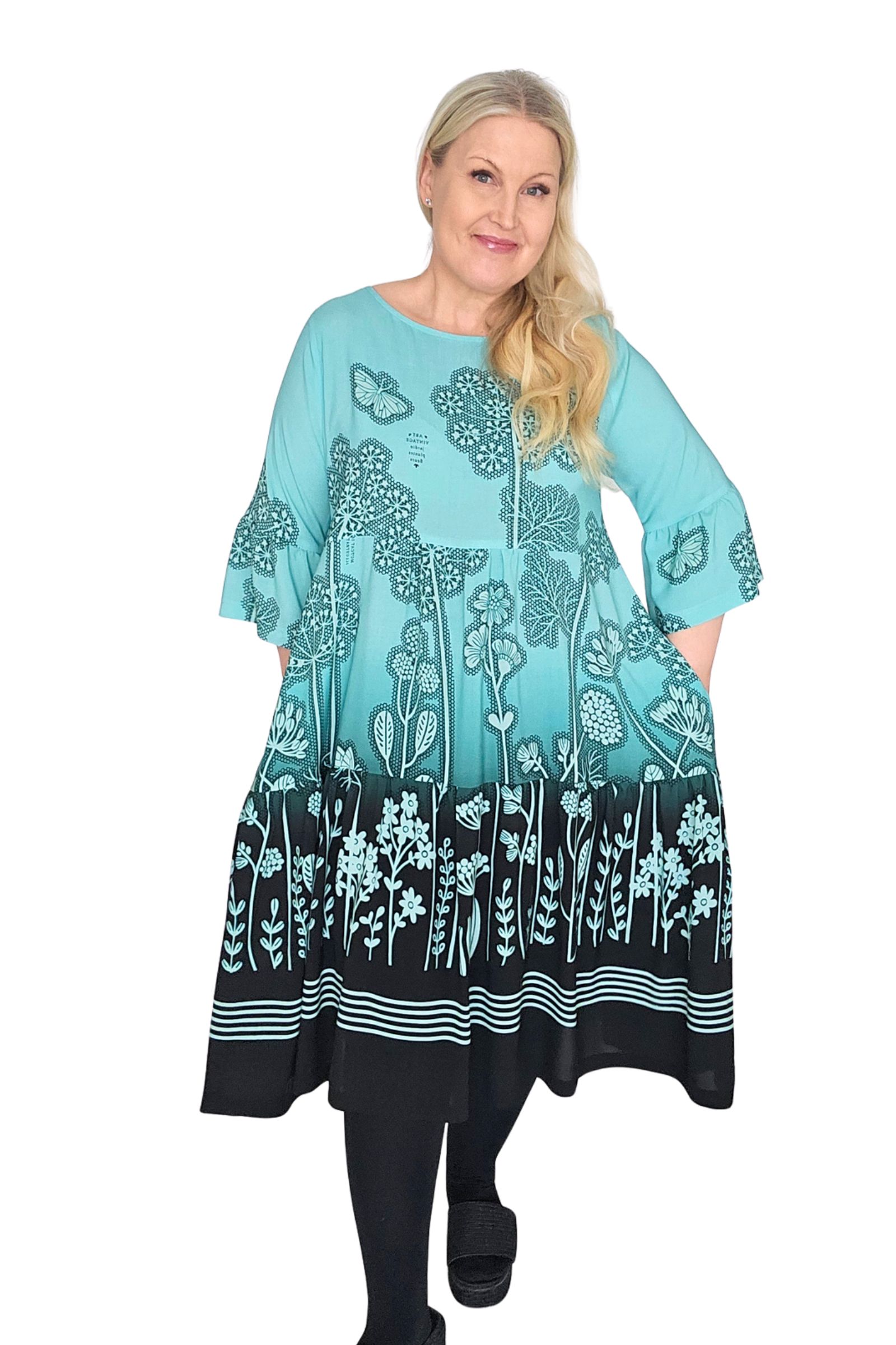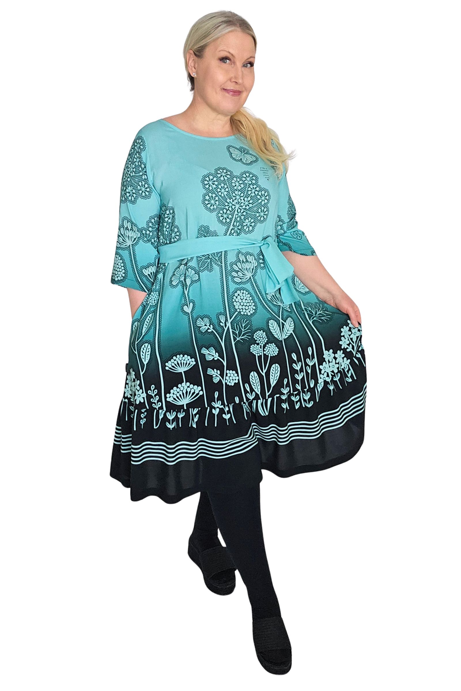 Kuosissa on kaunis vaalean turkoosi kuvio ja pohjaväri, jossa musta liukuu vähitellen petrolista turkoosiksi.